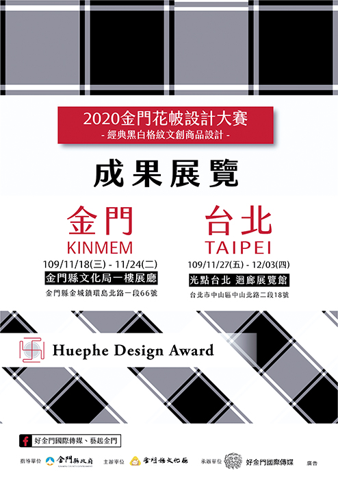 2020金門花帔設計大賽│經典黑白格紋文創商品設計,金銀銅獎得主揭曉。 2020金門花帔設計大賽經過激烈的競爭,前幾名終於揭曉,金獎得主林永昌-花帔方曆,銀獎得主蕭民遠│花帔巧克力;銅獎有2人,包括黃心芃-織光、馬治賢/李吉雅-馬帔Not bad。 佳作有15組,包括李欣庭、伍柍枚/吳宣/王靖茹、張芝綾/何素蘭、駱可薇/包幸子、張哲源、葉姿彤、賴謙忱/許芳萍、曾翰銘、吳瑋庭、李緒純、趙彩育、戴彤容、郭安妮、許瀞心/莊琇棋、鐘仁杰。 2020金門花帔設計大賽之成果展覽,金門場將於11月18日至11月24日在金門縣文化局1樓第一展廳辦理,並於11月18日下午2時起於金門縣文化局1樓大廳舉行金門場展覽開幕暨「拍你的花帔」攝影比賽頒獎。 台北場於11月27日至12月3日在光點台北2樓迴廊展覽館辦理。並於11月28日下午3時,辦理文創商品設計比賽頒獎典禮。 此次同時辦理線上「拍你花帔」攝影競賽,鼓勵喜愛攝影的民眾共同參與,上傳任何與花帔意象之作品,本次總收件數共計32件作品,最大獎項為「創意無限獎」拍立得。 首次設計競賽以金門「花帔」圖樣與精神為核心,考量量產特性,運用「花帔」布料圖樣進行設計、開發產品,例如:生活用品、文創商品、新創設計、布料織品等等,不限創作媒材。