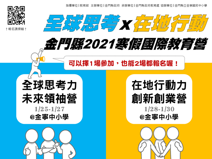 為培育本縣學子成為具備國際視野及在地實踐能力的新世代,由縣府教育處承辦、金寧中小學協辦的「全球思考×在地行動:金門縣2021寒假國際教育營」,活動時間為110年1月25日至1月30日於金寧中小學舉辦,即日起開放線上報名,參加對象為本縣國小4年級至高一學生,原錄取109學年度小日團、小紐團、中日團及中澳團學生得優先參加。 縣府教育處指出,營隊課程內容以本縣國際教育實施綱要「全球思考‧在地行動‧創新思維無國界」為規劃主軸,邀請由美國「世界和平遊戲基金會(World Peace Game Foundation)」正式授證之引導員,以遊戲式情境教學法規劃設計課程活動。 1月25日至1月27日「全球思考力:未來領袖營」將以角色扮演及遊戲進行方式,探討全球關鍵議題,培養孩子具備創新力、卓越力、表達力、決策力及協調力;1月28日至1月30日「在地行動力:創新創業營」則結合金門在地特色及社會企業精神模擬創業過程,營隊成果將舉辦園遊會實地銷售商品,啟發孩子創新精神、財務規劃能力,以及公民責任。 教育處表示,這類同性質活動在其他縣市收費不貲,但本次活動爭取中央款補助,讓金門縣學子以相對便宜的費用享受優質活動。雖然今年與明年受新冠肺炎疫情影響,取消辦理出國交流計畫,但教育處將持續辦理「疫情不出國,學習多更多」的國際教育增能學習活動,讓學子藉機累積實力,也讓未來開放出國交流時學習更有效益。 本次營隊報名請上google表單:https://reurl.cc/gm12RL,活動費用每人每場次新臺幣1500元(低收入戶家庭學生全額補助),更多資訊可上金門縣政府教育處網站〈http://www.km.edu.tw/news/17151〉及〈金門教育fun學趣〉臉書粉絲專頁查詢。