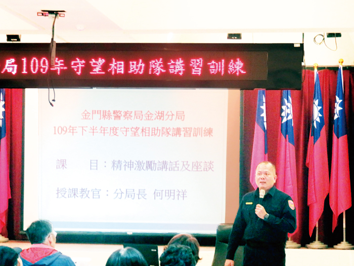 為有效提升守望相助隊隊員協勤能力,金湖分局邀集轄內3支社區守望相助隊成員,辦理「109年下半年度守望相助隊任務訓練講習」,計有45位隊員參加,透過講習了解自身任務以及目前治安工作重點,以期發揮互助合作精神,凝聚社區力量,共同為轄區治安和民眾安全共盡一份心力。 金門縣警察局金湖分局,日前假金湖分局禮堂舉辦「109年下半年度守望相助隊任務訓練講習」,召集轄內社區守望相助隊,包括金湖鎮新頭、金沙鎮忠孝及榮光3支守望相助隊,共計45位巡守人員與會。會中針對目前治安工作重點,自身協勤能力及相關法治觀念,巡守人員任務等,希望每位參訓巡守隊員都能夠提升自身協勤能力及相關法治觀念,以與警察勤務相結合,襄助社區警政之推動。 金湖分局也指出,期許藉由持續推展社區巡守工作,加強社區自我防衛能力。也透過講習促進守望相助隊員對自身任務及工作重點之了解,並發揮互助合作精神,與警察勤務相結合,凝聚社區力量,在社區建立安全體驗,共同防護居民生命、身體及財產安全。 金湖分局分局長何明祥表示,感謝守望相助隊巡守人員共同協助治安維護、急難救助及災害防救等工作。正所謂「警力有限,民力無窮」,唯有地方熱心人士的主動參與,襄助警力在社區推動各項安全防治工作,才能使社會治安更好,期許大家繼續以此服務熱忱,再接再厲,為金湖、金沙地區治安共盡一份心力。