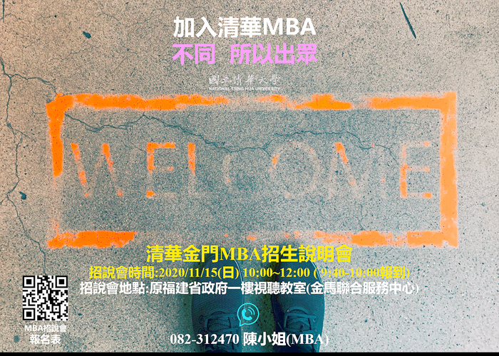 國立清華大學第三屆「經營管理碩士在職專 班(MBA)」乙組(全球化運籌組)金門班招生說明會將於11月15日(週日)上午10時至12時在金馬聯合服務中心(原福建省政府)一樓視聽教室舉行,由清華MBA專班主任李傳楷親自到現場說明,歡迎金門各界菁英學子踴躍報名本次招生說明會,先瞭解清華MBA和自己的需求是否相同,再考慮後續的報考。此次清華金門MBA招說會的報名方式一律採網路線上報名,報名網址https://reurl.cc/7oK4Xb,亦可電洽:082-312470國立清華大學金門教育中心(陳小姐)。 另外,內政部營建署受託代訓單位「財團法人自強工業科學基金會」在金門地區首開「營造業工地主任220小時職能訓練課程」,即日起開始報名,並首次將台灣自強基金會與知名業師聯盟金門一同講授,學員在地上課,無須遠赴台灣,方便金門鄉親就近授課。本次的課程預定開課時間為110年1月13日起至110年5月8日止(平日:每週一~週五上課,PM18:30 ~ PM21:30;週六、週日:AM9:00 ~ PM17:00),報名學員需符合營造業法第31條第1項各款之一所規定之資格,詳情請自行參照「清華大學金門教育中心」之粉絲專頁。 歡迎金門各界從事相關行業人士把握本次難得的機會抓緊報名,名額有限,每班額滿為止,報名網址https://reurl.cc/bRxLD3,一律採取線上報名,課程學費請逕自前往清華大學金門教育中心繳交。