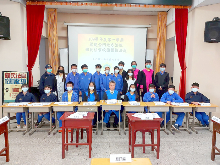 實踐108課綱精神和素養,金沙國中結合各類社群老師為學生訂定許多課程,並且利用全縣中小學運動會期間,帶領學生走入聚落進行鄉土踏查,程式語言以及戶外教育等,其中,民主公民思辨課程,在金門地方法院協助下,院長莊深淵率領團隊進行「國民法官模擬法庭活動」,學生模擬出庭的情況,不論是答辯亦或交叉詰問都相當有水準,師生也透過院長莊深淵的精闢解析,充實許多寶貴又實用的法律知識。 因應108課綱,金沙國中由各領域老師組成各類社群,並結合社區力量和社會資源,為學生開發製訂許多課程,期藉以啟發和提升多元智慧、生活適應與解決問題等能力。目前開設的課程包括,程式語言、英語戲劇、戶外教育、鄉土踏查、民主公民思辨等,並於全縣中小學運動會期間擴大課程參與,也從中檢視課程執行和學習情況。不論是體驗童玩風箏製作,亦或動手學習烘焙,手作帆布袋,及環境教育影片欣賞等,或走入聚落探訪宗祠歷史,學子臉上的笑容,反映學習的趣味。 其中,為培養學生公民素養及提升法律知識。日前金沙國中教務處在金門地方法院協助下,進行「國民法官模擬法庭活動」。會中,由院長莊深淵擔任審判長,學生扮演陪審法官、檢察官、辯護人、原告、被告、國民法官等。莊深淵院長仔細的解說及引導,模擬過程相當逼真,學生雖然依據社會上發生實例改編的劇本進行模擬開庭過程,但不論是劇本論述亦或當場答辯和提問都相當有水準;雖然過程中超出劇本外的詰問過程製造不少笑點,但仍可以觀察出學生的臨場反應及對活動的認知。不論是學生或老師都從中獲得相當寶貴又實用的法律知識。 金門地方法院院長莊深淵表示,這是第一場金門地區國中端的國民法官模擬法庭宣導活動,在金沙國中的協力下,讓法院團隊有機會向8年級學生宣導國民參與刑事審判制度推廣情形及其目的。並希望學生從模擬的過程中認識法律知識,達到校園法治教育的目的,也協助學子提昇相關公民素養,以因應未來的需求。 校長黃明森也指出,金沙國中在課程方向也以培育學生未來能力為主。法律與我們的日常生活其實相當密切,學校強調的不是讀完公民課本,而是能落實法律的素養,故希望透過課程帶領學生了解如何能應用,也謝謝金門地方法院之協助,為師生上了一堂寶貴的公民素養課。