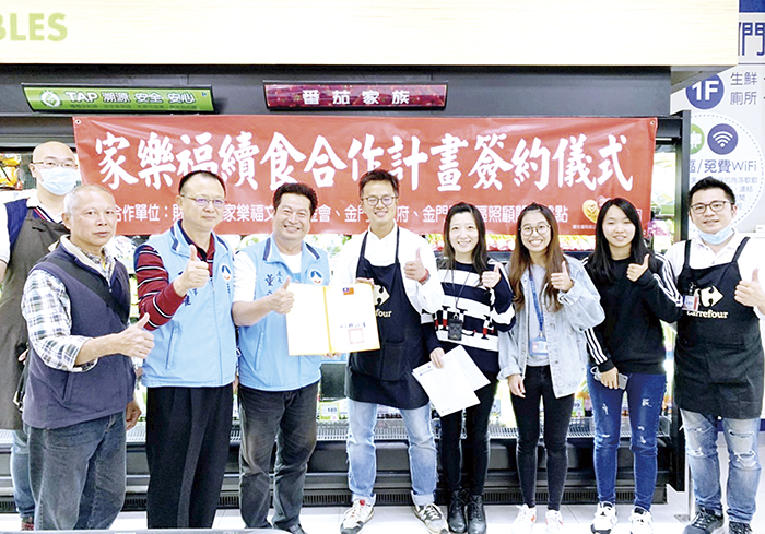 金門縣政府社會處媒合社區照顧關懷據點,與家樂福文教基金會合作「續食計畫」,並於昨(十)日舉行簽約儀式,由財團法人家樂福文教基金會經理李欣穎及家樂福金門分店經理林信邦與合作社區金沙鎮忠孝新村社區發展協會、金寧鄉盤山村社區發展協會及金城鎮後豐港社區發展協會說明續食合作計畫,並引導領取續食動線及流程。縣府社會處處長董燊代表縣長楊鎮浯致贈家樂福文教基金會感謝狀,期透過合作秉持著食物不浪費、延續再利用、關懷弱勢,將即將被浪費的食材賦予新生命,回饋予社區民眾,化作為人們帶來幸福的能量。 家樂福文教基金會於二○一六年開始持續進行「反食物浪費│家樂福續食計畫」,由受過食物安全訓練的員工,每天將門市中保存期限皆符合標準的即期品食材與未販售完的蔬菜、麵包等物資,捐贈予門市附近的弱勢團體。 社會處表示,此次透過金門縣實物銀行服務媒合社區據點與家樂福續食計畫攜手合作,社區發展協會輪流每日分派志工至家樂福金門分店領取即期食品,透過志工重新包裝、整理,提供照顧關懷據點老人共餐、分享給需要的人食用。 地區社區照顧關懷據點常年提供全縣六十五歲以上長者在地化社區照顧,維護社區長者及弱勢民眾身心健康及生活品質。社會處處長董燊盼未來能持續結合其他民間團體及愛心企業,妥善運用實(食)物資源,並提倡惜食、減少食物浪費,讓實物銀行服務深入社區,延續續食精神幫助更多人。