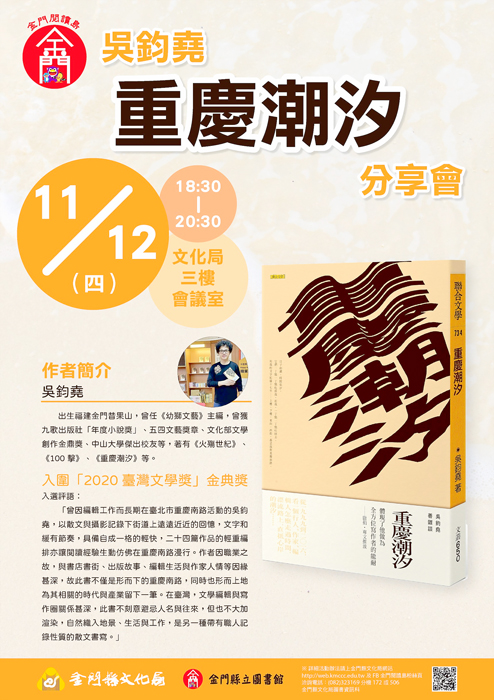 《重慶潮汐》入圍「2020臺灣文學獎」金典獎。金門縣文化局將於11月12日晚上18:30於文化局三樓會議室,邀請知名金門籍作家吳鈞堯,為大家分享他最新著作「重慶潮汐」(見圖),歡迎有興趣的讀者踴躍參加。 吳鈞堯曾任《幼獅文藝》主編,出生金門,現專職寫作,執筆兩岸等華文傳媒專欄。作品曾獲《中國時報》、《聯合報》等小說獎,梁實秋、教育部等散文獎,以及九歌「年度小說獎」、五四文藝獎章(教育類與小說創作)、文化部第三十五屆文學創作金鼎獎。著作多種,主要有金門歷史小說《火殤世紀》、《遺神》、《孿生》,散文集《荒言》、《熱地圖》、《一百擊》、《回憶打著大大的糖果結》,童書繪本《三位樹朋友》等。 吳鈞堯今年以《重慶潮汐》入圍「2020臺灣文學獎」金典獎,這本著作書名「重慶」指的是空間的台北市的重慶南路,從出自遠方的地名關聯,延伸到他近身的編輯檯,以重慶南路的幼獅公司為原點、半徑五百公尺的鄰近街道做書寫版圖:開封、漢口、武昌、沅陵街等,有新公園、城中市場、明星咖啡館、中山堂與總統府……座落其間。 「潮汐」說的是時間。路寬似海,來回往復。人流、車流,合力湧動著一股能量,轉動街景的變化:從猶是手工為主的九○年代、數位化衝擊的世紀初、以迄新媒體的當代,他看盡這條路的盛衰流變:老字型大小書店、台北相機街、沅陵皮鞋街、金石堂與現代詩、劉銘傳傳奇……亦同步喚起人生各階段的成長經驗,領會歲月的起伏積澱。 作者緣於職場工作因素,擔任《幼獅文藝》的主編,在重慶南路上盤桓十七年,以作家視角觀察,帶領民眾重新探索重慶南路這條眾人熟知的書街所引發的故事。 本講座無需報名,歡迎自由入場,當天講座現場會有10本「重慶潮汐」書籍致贈給金門閱讀島的讀者,並請作家吳鈞堯親筆簽名,歡迎有興趣的民眾踴躍前往聆聽。 文化局特別提醒大家,為配合中央及金門縣政府防疫措施,參與活動應配戴口罩,肥皂勤洗手,若有出現發燒、咳嗽或呼吸急促症狀,請勿出席參加,謝謝讀者配合。