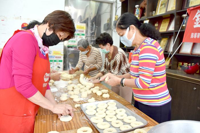 詹宗翰/圖文 南門莒光志工隊2日假南門里民活動中心舉辦美食教學活動,用熱騰騰、甜蜜蜜的炸甜甜圈,將隊員的心給串在一起。 這項由金城鎮樂齡學習中心指導,志工隊隊員發起的美食製作,日前下午製作甜甜圈。志工隊隊長陳大隆表示,今年共安排了二次的美食製作,本次製作甜甜圈由有製作經驗的志工許淑真擔任種子教師,將製作的技巧與其他志工分享。將發酵好的麵糰揉圓、稍壓平,然後用壓模在中間開一個洞,分批次放入高溫的油裡油炸,待油瀝乾、裹上糖粉,就大功告成啦! 剛炸好的甜甜圈鬆軟可口,令人看了食指大動,沒能到場品嚐的隊員事後透過LINE群組照片得知,只能扼腕。