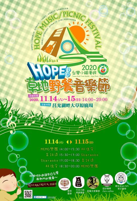 金城鎮公所將於11月14、15日於金城鎮莒光湖畔大草原廣場辦理「Hope草地野餐音樂節」(見圖)活動,並邀請網路上最夯的排隊人氣美食知名餐車開抵金門,鎮長李誠智歡迎大小朋友曬暖陽、吃美食、聽音樂,享受悠閒時光,感受令人驚喜的秋日氛圍。 這項草地野餐音樂節由金城鎮公所主辦,將於11月14、15日下午二時至晚間八時舉行,兩天活動中將邀請來自台灣「CHOCOBear 巧克熊環島餐車」、「Lighthouse Food Truck 燈塔餐車」、「River&Truck披薩車」、「Devil&Angel-惡魔天使餐車」、「啤先生mr.pipi美式餐車」、「這好咖啡Zero coffee」,以及金門在地的「肥忠滿煎糕」等7組餐車,在現場提供美食販售服務。主辦單位將邀請曾參加大型歌唱選秀節目「聲林之王2」的金門子弟「呂評逵」,他擅長木吉他彈奏,並用抒情、溫柔嗓音,傾訴每一段故事,此外還有MEMO樂團、Skaraoke及林鴻宇等音樂團體或個人輪番進行演出。 李誠智說,金城鎮莒光湖畔擁有廣大草地空間,兒童喜愛的長頸鹿樂園;從去年底開始,金門民間社團也利用這個場域舉辦了公民活動,獲得鄉親們廣大的迴響。此回公所串聯「野餐」、「餐車」和「音樂」三大元素,向鄉親及觀光客舉辦「Hope草地野餐音樂節」,引進台灣知名的特色餐車打造特色市集,除了延伸這股熱潮,優化場域運用外,更期盼可以發展為居民日常休閒樣態,成為金城鎮的常態化特色活動,藉此彰顯後浦經典小鎮、慢活樂遊的獨特魅力;另外,還希望藉由寬闊的草地、清新的空氣、迷人的音樂表達身處自由民主之境、遠離疫病的「希望(Hope)」意涵,為所有為疫情所苦及奮戰不懈的人們加油打氣。