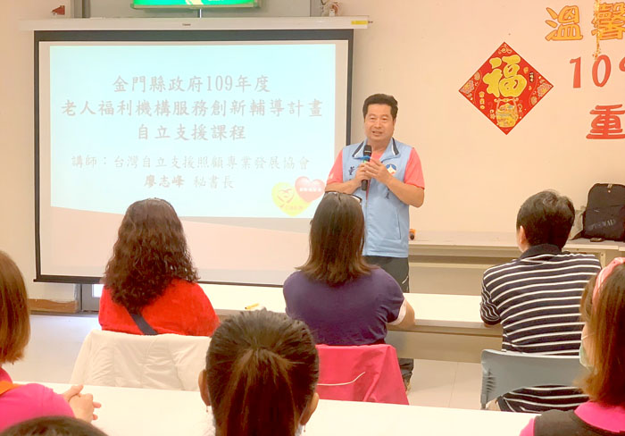 金門縣政府為維護本縣社福機構老人權益並強化機構服務量能,特於11月7、8日上午9時至下午4時30分,於金門縣松柏園老人長期照顧中心辦理「自立支援課程」,邀請台灣自立支援照顧專業發展協會廖志峰秘書長授課,安排一系列的體驗課程讓學員可以親自感受長者受束縛的不適,並指導跳脫約束的框架下該如何照顧? 社會處長董燊表示,縣府團隊在楊縣長領導下很關注鄉親照護工作,在傳統照顧思維下,未考慮長輩真正需求,而缺乏積極性的生活自立訓練,相對於自立支援照顧模式,強調幫助失能長輩恢復自主生活能力,解決其所面臨的日常生活功能問題,包含沐浴清潔、穿衣、進食、移位、如廁、走動等,透過落實四大基本照顧策略,包括「水」、「飲食」、「排便」、「運動」四個原則,逐漸訓練長輩恢復身體功能,得以自主攝取足夠水分、食物,定時排便,適當運動,提升長輩生活品質,恢復尊嚴,而達到「零約束」、「零臥床不起」、「零尿布」三大目標。董燊表示,雖然金門縣對65歲以上長輩及身障鄉親有提供全年尿布服務(全國獨創全年每月提供宅配送到家),但希望長輩健康備而不用,所以「自立支援照顧模式」光是改變機構照顧的觀念還不夠,還要讓老人家也有接受新模式的動機。很多來到養護機構的老人灰心喪氣,但只要認知能力還正常的,沒有一個老人想臥床讓人把屎把尿,或是讓人脫光光伺候著洗澡,而失去了做人的尊嚴。只有讓老人體會到,提升自我照顧的能力能改善生活品質,老人家才有動起來的希望。 縣府表示,盼本縣老人機構能考慮長輩真正需求,且積極的執行生活自力訓練,落實四大基本照顧,訓練長輩恢復身體功能、恢復尊嚴,持續朝著三大目標前進。
