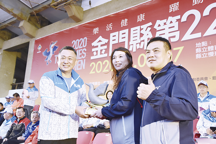 2020金門縣第22屆運動會經過一連三天的各項田徑比賽,在縣運會壓軸徑賽的學校、機關組大隊接力賽之後,於昨下午五時頒獎閉幕,由縣長楊鎮浯、體育會理事長唐麗輝、行政院金馬聯合服務中心執行長翁明志、教育處處長羅德水頒獎予表現優異的選手;今年的縣運會總共締造了8項11人次破縣運會紀錄。 縣長楊鎮浯在頒獎表揚優勝團體和個人後,表示金門縣政府將持續打造優質運動場館,充實軟硬體設備,制定地區體育發展計劃,優化地區體育發展,達成樂活健康、躍動金門的目標。 今年的金門縣第二十二屆運動會於11月5日在縣立體育運動場開幕,計有11種類、139次序田徑賽事;並有61個單位,包括中央駐金單位暨縣府所屬機關學校、鄉鎮和社福機構選手計5,024人次,表演團體及啦啦隊955人,共計6,135人參與並設身心障礙組的比賽,總計地區各機關、學校、學生組、工作人員、裁判等,共約有6,466人共襄盛舉。縣運會首日進行十餘項目四十餘次序的田徑預決賽;第二天及今日最後一天接續進行九十餘次序的各組田徑賽項目預決賽,全縣運動選手同場競技,角逐各組金牌、冠軍寶座和錦標。 縣運會壓軸徑賽於昨下午三時起登場,在楊縣長鳴槍,學校和機關分組上場進行計時賽;在機關組中,楊縣長更親自下場,帶領縣政府大隊接力隊伍參賽;而學校機關組精彩的大隊接力比賽,員工選手奮勇向前跑,贏得在場運動選手和觀眾的喝采和加油。 楊縣長在縣運會閉幕典禮致詞表示,金門要有優質的團隊,也要有強健的體魄;取得好的成績,以及給予更好的運動發展環境和資源,未來能在國內、國際體育運動賽事同場競技,爭取金門的榮譽。 「台上十分鐘,台下十年功」,唐麗輝感謝各級學校對於各項運動教育推動的努力,及各運動委員會於此次展現的專業,與人員的密切合作。她勉勵在場的選手們,希望這次所展現的成果,能做為下次再努力超越的目標。 最後,金門縣第22屆運動會在降下大會會旗之後,正式宣告圓滿落幕;楊縣長表示因為大家的努力與付出,讓金門縣第22屆縣運會更精彩,感謝籌備會和裁判、金大學生,「辛苦了」,並祝大家平安健康,未來有更好的運動成績。 今年共有8項11人次破大會紀錄,分別為:社會男子組金沙鎮陳峻弛,200公尺22.24秒,破大會22.39。社會女子組金湖鎮林筱容,跳遠4.76公尺,破大會4.71公尺。社會女子組金沙鎮張明惠,鉛球10.52公尺,破地區10.19公尺。社會女子組烈嶼鄉公所王若慈,鉛球10.22公尺,破地區10.19公尺。社會女子組烈嶼鄉公所王若慈,鐵餅42.73公尺,破地區32.67公尺。高中女子組金門農工李芷璇,200公尺26.83秒,破地區26.92秒。國中男子組烈嶼國中林瀚亞,鉛球13公尺,破大會及地區同組11.55公尺。國中女子組金城國中林玟,200公尺26.53秒,破大會27.40秒及地區26.92秒。國中女子組金城國中林玟,200公尺26.95秒,破大會27.40秒。國中女子組金城國中林玟,400公尺61.64秒,破大會63.91秒。國中女子組金城國中林玟,400公尺60.08秒,破大會63.91秒及地區60.14秒。國中女子組金城國中盧悅玲、洪睿彤、薛琪仙、林玟,4×100公尺接力54.11秒,平大會54.11秒。 金門縣第22屆運動會各組團體成績如下: 社會男子組田徑錦標:冠軍金城鎮、亞軍金湖鎮、季軍金沙鎮;社會女子組田徑錦標:金湖鎮、金寧鄉、金沙鎮;高中男子組田徑錦標:冠軍金門高中;高中女子組田徑錦標:冠軍金湖農工;國中男子組田徑錦標:冠軍金寧中小學、亞軍金城國中、季軍金湖國中;國中女子組田徑錦標:冠軍金城國中、亞軍金寧中小學、季軍烈嶼國中;國小男子組田徑錦標:冠軍中正國小、亞軍柏村國小、季軍金湖國小;第4名古寧國小、第5名金鼎國小、第6名古城國小、第7名湖埔國小、第8名卓環國小;國小女子組田徑錦標:冠軍中正國小、亞軍古城國小、季軍賢庵國小、第4名金湖國小、第5名西口國小、第6名金沙國小、第7名上岐國小、第8名柏村國小。 社會男子組桌球:冠軍金寧鄉、亞軍金湖鎮、季軍金城鎮;社會男子組籃球:冠軍金沙鎮、亞軍金城鎮、季軍烈嶼鄉;社會女子組籃球:冠軍金湖鎮、亞軍金城鎮、季軍金寧鄉;社會男子組羽球:冠軍金沙鎮、亞軍金城鎮、季軍金湖鎮;社會男子組壘球:冠軍金城鎮、亞軍烈嶼鄉、季軍金寧鄉;社會男子組木球:冠軍金城鎮、亞軍金沙鎮、季軍金湖鎮;社會女子組木球:冠軍金城鎮、亞軍金湖鎮、季軍烈嶼鄉;社會男子組網球:冠軍金寧鄉、亞軍金城鎮、季軍金沙鎮;社會男子組跆拳:冠軍金湖鎮、亞軍金寧鄉、季軍金城鎮;社會女子組跆拳:冠軍金寧鄉、亞軍金湖鎮、季軍金城鎮。 機關接力:冠軍消防局、亞軍金門酒廠、季軍金門縣政府、第4名金門航空站、第5名警察局、第6名金湖鎮公所、第7名港務處、第8名金門醫院;學校接力:冠軍金湖國中、亞軍金鼎國小、季軍中正國小、第4名金門高中、第5名賢庵國小、第6名金門農工、第7名金湖國小、第8名金沙國小。表演組:金門縣體育會土風舞運動委員會、開瑄國小、金寧中小學、金鼎國小。