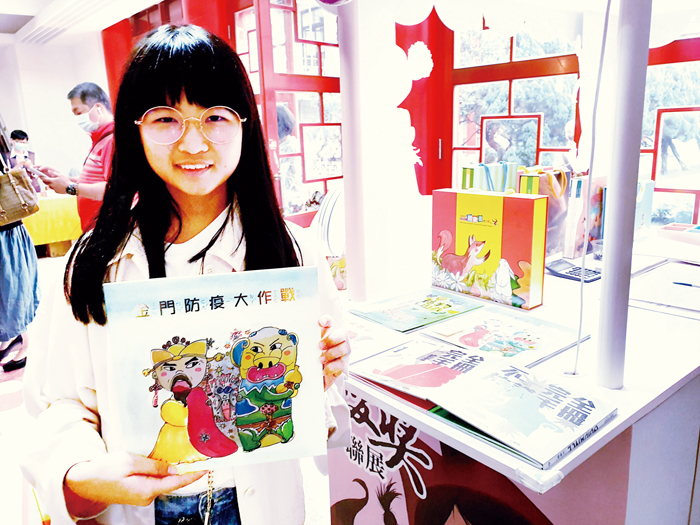 金湖國小畢業生陳蘋妤同學在楊玉蘭老師指導下所創作的圖畫書「金門防疫大作戰」,近日榮獲2020年「全國學生圖畫書創作獎」國小高年級組「特優」,該書也由國立臺灣藝術教育館出版,陳蘋妤正式成為一位兒童圖畫書新秀作家。 為鼓勵兒童圖畫書創作、發掘及培育圖畫書創作人才,教育部所屬國立臺灣藝術教育館自95年起至今已辦理15屆「全國學生圖畫書創作獎」。本屆共186所學校、1233名學生參與,參選件數959件,得獎作品含特優、優選、甲等及入選共計115件。金湖國小畢業生陳蘋妤同學創作的「金門防疫大作戰」,在眾多優秀的參賽作品中脫穎而出,榮獲本屆國小高年級組「特優」(相當於第一名),實屬不易。 評審們一致認為該書是結合時事與金門風俗的優異之作,作者觀察入微的描繪細節,每一尊風獅爺、動物、城隍爺和陣頭都有所本,連蝴蝶頁的花紋都和金門傳統揹巾「花帔」花樣符合,豐富、誇張的人物表情,構圖具有兒童圖畫書的趣味,非常符合圖畫書的創作精神,實為完整而獨特的優秀作品。 得獎同學陳蘋妤說,為了參加這次的圖畫書創作比賽,她以金門的守護神-風獅爺及城隍爺為主角,搭配防疫的時事議題,總共畫了數十張的畫作,再配合文字的敘述,將金門的點滴以趣味的方式介紹給讀者,希望大家在欣賞她的圖畫書時,同時也認識到她的家鄉-金門。而在得知自己的書獲獎好消息時令她雀躍不已;更在知道主辦單位也會將她的圖畫書於全國各地巡迴展出,並編輯出版及製成電子圖書後,她的心中更是充滿了興奮之情。 指導老師楊玉蘭表示,金門是個自然生態豐富、人文薈萃、民俗風情保存完整的島嶼,「金門防疫大作戰」即是以「金門」為故事發想的源頭,構思將金門居民傳統信仰中的兩大神祇—城隍爺、風獅爺介紹給閱讀繪本的大讀者、小讀者認識,於是就天馬行空的將城隍爺、風獅爺二者結合起來,再加入最新時事,也就是人人聞之喪膽、避之唯恐不及的瘟神「新冠病毒」,成為故事主軸「三大主角」,展開一場時空交錯、跳脫傳統故事窠臼的神奇之旅。 此外,該圖畫書也加入兩個「彩蛋」,可以成為後續延伸閱讀的基礎。一是將金門花帔巧妙結合防禦力等級最高的N95醫療用口罩,化身成為打敗新冠病毒的「恩玖伍大布袋」,讓讀者在莞爾一笑中,認識金門人從小被它保護過,也是最能代表金門意象之一的「花帔」。另一是金門特有的保育類動物「水獺」,從繪本蝴蝶頁到內頁穿插其間,仔細尋覓就可看到牠活潑逗趣的蹤跡,可以玩玩「找找水獺在哪裡」的小遊戲,認識這模樣可愛,但目前全國只剩在金門看得到,已經瀕臨絕種的保育類動物「水獺」。
