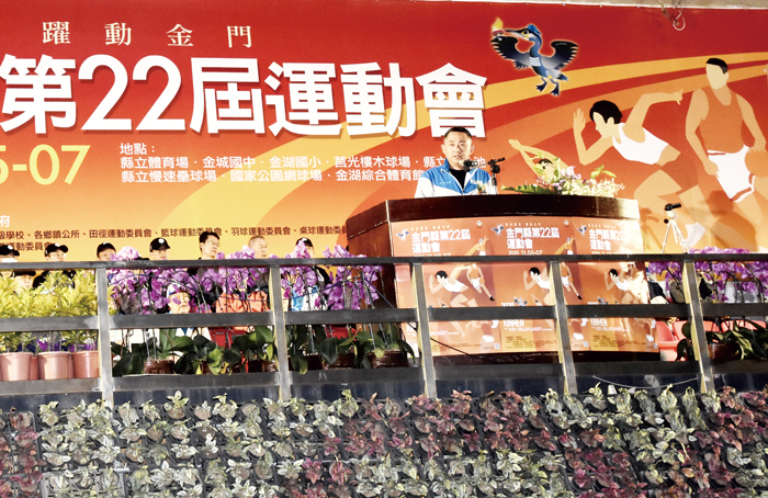 金門縣第二十二屆運動會昨日起正式展開三天的運動賽程,昨日傍晚並舉行開幕典禮,大會主席楊鎮浯縣長致詞時表示,體育象徵一個地方的整體活力,縣府將持續打造優質運動場館,充實軟硬體設備,制定地區體育發展計劃,優化地區體育發展,達成樂活健康、躍動金門的目標。 縣運會分別在金門縣立體育場、莒光樓木球場、金門縣立游泳池、金門縣立慢速壘球場、金湖國小、中正國小、縣立網球場、金湖綜合體育館等進行各項競賽的會前、正式比賽。 第二十二屆縣運會開幕典禮於昨日下午五時三十分起在縣立運動場展開,開幕活動首先由金門管樂團帶來音樂饗宴,緊接著由開瑄國小帶來「鼓震活力.躍動金門」演出、金門體育會土風舞運動委員會的「舞動人生.樂活健康」、金寧中小學及金鼎國小的「熱情奔騰.榮耀體育」等表演,為整個開幕典禮炒熱氣氛。 隨即,啦啦隊進場表演、運動員也接續進場,第一進場的是烈嶼鄉,其後烈嶼各級學校接著進場,後續依序金寧鄉、金沙鎮、金湖鎮、金城鎮等鄉鎮轄區內的機關、學校或單位,最後壓軸進場的是金門縣政府,而這當中有不少隊伍都相當有特色,令人眼睛一亮! 大會主席楊鎮浯縣長、行政院金馬聯合服務中心執行長翁明志、金門地方法院院長莊深淵、金門體育會理事長唐麗輝議員、以及董森堡、張雲德、歐陽儀雄、李養生、陳志龍議員等貴賓,也都在司令台前向進場的運動員揮手致意。 縣運會會旗由金門高中樂隊和儀隊引導之下緩緩進場,並向司令台敬禮致敬;接續由地區運動好手陳彥維、楊肅維、蔡玉玲、李宥萱手持縣運會聖火進場,繞場一週後跑上聖火台點燃聖火,配合低空煙火,天空璀璨光明,隨後升起縣運會大會會旗、唱國歌。 縣長楊鎮浯致詞表示,今年雖然受疫情影響,但在金門各界共同努力下,金門始終維持零確診的紀錄,感謝大會籌備委員會及相關單位,在疫情可控下做好各項準備工作,奠定舉辦第22屆縣運會的基礎。 楊鎮浯表示,體育即國力,更象徵一個地方的整體活力,金門縣政府將持續打造優質運動場館,充實軟硬體設備,制定地區體育發展計劃,優化地區體育發展,達成樂活健康、躍動金門的目標。 唐麗輝指出,從全國運動會的成績可以看到金門體育會努力的痕跡,體育是展現國力最重要的一環,金門體育會本著承接中央政策銜接地方體育特色,推動全民體育與促進全民健康,也感謝縣府、議會對於體育會的支持,祝福選手們再創佳績。 本屆金門縣運動會,比賽項目包含有:田徑、籃球、羽球、慢速壘球、桌球、跆拳、游泳、木球、網球、大隊接力、趣味競賽等,參賽選手5,024人次,表演團體及啦啦隊955人,總計6,135人參與並設身心障礙組的比賽,總計地區各機關、學校、學生組、工作人員、裁判等,共約有6,466人共襄盛舉。 縣運會比賽有十一種類,包括田徑、籃球、羽球、桌球、網球、木球、慢速壘球、游泳、跆拳道、趣味競賽以及大隊接力等,並分成包括:社會男子組、社會女子組、機關學校團體組、高中男子組、高中女子組、國中男子組、國中女子組、國小男子組、國小女子組、身心障礙男子組、身心障礙女子組。另外,也有不少赴台就讀各級學校之縣籍學生,也應戶籍所在地之鄉鎮的徵召,返金為鄉爭光。