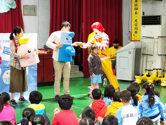 洗洗、動動、健康Go! Go!(健康夠夠!)「麥當勞叔叔」日前到古城國小進行「一起洗手趣」公益宣教活動。他運用廣受兒童及大人喜愛的「超人氣」,教導小朋友們正確洗手的方式。現場還用泡泡機做出抹肥皂的效果,讓約一百二十四雙小手,在空中搓抹,小朋友們興奮無比。 古城國小校長楊成業也期勉學童要將正確洗手五步驟落實日常生活中,加強做好個人自我衛生管理,才能遠離腸病毒及其他病毒或病菌等傳染病纏身的威脅。 對付腸病毒最有效的妙招就是做好正確洗手。因此,行政院衛生福利部與金門縣衛生局,特別洽請麥當勞叔叔到地區國小及幼兒園巡迴宣導「一起洗手趣」正確洗手五步驟,希望藉由麥當勞叔叔的群眾魅力,加深小朋友正確洗手的觀念。麥當勞叔叔今年要在全國巡迴一百五十場次「一起洗手趣」公益宣教活動;其中在金門共有四場,主題為「洗洗、動動、健康Go! Go!」。 金門目前並沒有麥當勞速食店,但麥當勞叔叔的魅力,卻是無遠弗屆。在金門雖然沒能買到麥當勞漢堡、薯條,但透過媒體傳播總看過麥當勞叔叔的廣告。小朋友們對麥當勞叔叔的來臨,都顯得特別興奮,很起勁地跟隨著他做出正確洗手的動作,跟隨著他伸手、抬腳地做運動。 在活動中,麥當勞叔叔藉著魔術和丑角搞笑的功力,把小朋友逗得哈哈大笑。一根魔術棒,在麥當勞叔叔手裡是硬直而立的,到小朋友手裡就垂軟成線。 進入主題後,麥當勞叔叔則搬出道具,由校長楊成業戴上紅色大手套,成為眾目的焦點,讓大家看到他要怎麼洗手。幼兒園小班老師陳志惟套上道具,扮成大大的水龍頭,教保員徐淑雯則扮成一大罐洗手乳,幼兒園主任呂文珠扮成一大盒抽取式衛生紙。當依次完成溼、搓、沖、捧、擦的五步驟之後,麥當勞叔叔還提醒孩子要注意一個很重要的細節,那就要用手隔著衛生紙來關上水龍頭。活動中,並穿插著有獎徵答來激發學童的興趣與專注力,小朋友個個踴躍爭先搶答,熱烈回應。 活動最後,古城國小校長楊成業代表該校致贈一幀感謝狀給麥當勞叔叔,感謝麥當勞叔叔蒞校進行「一起洗手趣」公益宣教活動,嘉惠學子,同時楊校長也特別與麥當勞叔叔跟全校小朋友合影留念,為整個公益宣教活動劃下圓滿句點。