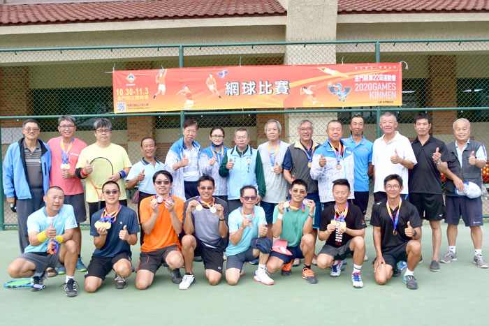 圖文/莊煥寧 金門縣第二十二屆運動會之網球比賽,在經過二天的賽程後成績揭曉,由縣立體育場場長蔡木川、金門縣網球運動為委員會主委黃金郎頒發獎牌給予績優選手。 縣運會網球競賽成績(名次)分別為: 團體賽:第一名金寧鄉、第二名金城鎮、第三名金沙鎮。 單打賽:第一名陳偉銘、第二名翁明璽、第三名任皓。 雙打賽:第一名陳偉銘、任皓;第二名楊恭汪、柯辰;第三名陳順國、翁明璽。