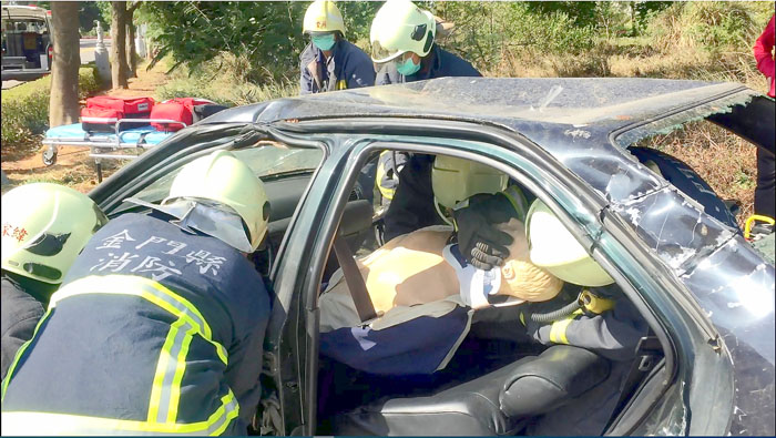 金門縣消防局第二大隊(金湖分隊)近日辦理車禍救助大隊組訓,由金沙消防分隊承辦,所屬義消分隊長,同時也是議員李應文率義消張晉榮、林銘凱、石傑仁全程參與,同大隊之金湖消防分隊及所屬義消同仁協辦,並由大隊長陳叁奇全程主持指揮。 第二大隊大隊長陳叁奇表示,為強化同仁車禍脫困救護技術及車體破壞裝備器材緊急應變能力,提昇車禍救援救助技能,第二大隊舉辦車禍救助組合演練,情境假設一名民眾於金沙轄區疑似超速,不慎衝撞路燈及行道樹,造成交通嚴重堵塞。 金沙及金湖消防分隊人員獲報抵達現場救援,現場研判事故車車頭半毀,人員受困於駕駛座且嚴重漏油,恐有引起火災之虞,並可能危及救災人員和傷患安全,指揮官立即下達指令佈署消防水線防護及滅火器進行警戒並請求轄區員警接手交通管制;消防人員利用枕木墊塊及頂舉氣袋執行車輛穩固作業,並立即以各式破壞器材破壞車體,順利將傷患脫困,整個演練過程詳實逼真,路過民眾紛紛停下關心詢問,猶如真實救災現場一般。 消防局局長翁宗堯表示,分隊同仁平時均依勤務加強各式救災救護訓練,以提升人命救援能力,救災裝備器材及使用技巧需不斷磨練砥礪,方能提昇改進,訓練是為了讓同仁因應瞬息萬變的災害現場,經由此次車禍救助之大隊組合訓練,加強同仁對於救援之技能與熟練度,未來將賡續執行各項救災救護訓練,並於相關聚會活動宣導防災工作,以落實維護地區民眾生命財產安全重責。