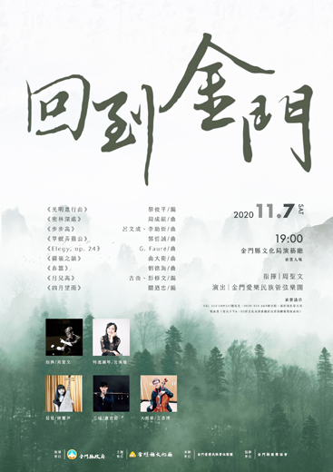 金門愛樂民族管弦樂團年度公演《回到金門》,11月7日晚間7時起於金門縣文化局演藝廳舉辦,文化局誠摯歡迎愛樂好朋友們共襄盛舉。 金門縣文化局指出,本場演出採索票入場,11月2日上午9:00起開放索票,索票相關資訊如下:1、文化局演藝廳值日室,082-323169#333劉先生。2、金門愛樂窗口,0939-934-689陳小姐。3、演出當天現場索票;11月7日下午6:00於文化局演藝廳前台票務櫃檯開放索取,數量有限,送完為止。 成立至今已滿三週年的金門愛樂,由金門在地一群專業且具熱情的青年演奏家共同組成,成軍三年以來,在金門國樂協會的引領下,奠定了良好的發展基礎,累積演出場次已逾二十餘場,深入金門各鄉鎮、學校,提供專業卻又易於親近的藝文體驗。今年,在文化局的傑出演藝團隊計畫的挹注之下,樂團年度活動不論規模、深度、廣度,皆有所提升,受到各界好評。 本次音樂會,為金門愛樂年度活動中的重頭戲。音樂會標題《回到金門》發想自「返鄉」概念,並搭配兩大主軸:一、邀請三位正在台灣攻讀音樂科系的金門子弟陳璽尹、王彥博、盧宜庭回鄉擔綱獨奏演出;二、該團團員返鄉服務、心繫金門國樂未來的一份悠悠心情。 節目安排上,本次音樂會特地設計了三大欣賞重點:一、絲竹室內樂:透過小編制的室內樂形式,演繹傳統、經典國樂室內樂樂曲,體現國樂小而美的迷人之處;二、獨奏曲:三位金門子弟將與特邀鋼琴演奏家連袂登台,以一人一舞台的方式展示他們所學;三、大型合奏曲:金門愛樂全體團員共同組成20餘人樂隊,演繹經典國樂曲目。 演出曲目:黎俊平:《光明進行曲》;周成龍:《密林深處》;呂文成、李助炘:《步步高》;郭哲誠:《草螟弄雞公》;G. Faure: The Elegy, op 24;曲大衛:《疆嶺之韻》;劉德海:《春蠶》古曲;彭修文編:《月兒高》;關迺忠編:《四月望雨》。