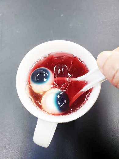 10月31日是萬聖節,柏村國小昨(30)日上午舉行萬聖節派對活動,最吸睛的是學校老師用蔓越莓果汁調製成血紅色飲料,並用奶酪做成大眼珠,放在飲料內當甜點,看起來十分血腥,非常有萬聖節氣息。學校小朋友吃下這特調「血腥巫婆眼珠子」甜點,都說很好吃。 柏村國小昨日主題為恐怖、鬼怪、巫婆,活動以301、501班變裝表演活動揭開序幕,老師們也盛裝鬼怪打扮,如聶小倩、小小兵、兔裝、巫婆裝、米奇米妮通通出籠,全校百餘名師生創意的開心鬼打扮,讓柏村的校園充滿萬聖節詭異氛圍,501班何明祐在開場舞中扮演恐龍,炒熱活動氣氛,小朋友安可聲不絕於耳。 301班陳謙慧老師以小小兵裝扮帶領全班變裝大跳開幕舞,501班陳保辰老師製作「柏村國小萬聖節特調血腥巫婆眼珠子」飲品,老師特別用蔓越莓果汁製作紅色飲料,用奶酪製作黑白大眼珠,讓眼珠子浮沉在紅色血泊之中,營造恐怖感、血腥感。原本想帶給學生驚訝,沒想到小朋友都表示不可怕,飲品很好吃,全校師生在歡樂的鬼群鬧氣氛中,渡過開心的萬聖節。 顏岑羽老師安排活動穿插以萬聖節鬼怪傳說為主題的闖關活動,優勝隊伍獲得校長獎勵,莊彩雲主任期盼小朋友在每一年不同的體驗活動中,開啟想像的世界,體驗西洋文化,與世界做朋友。