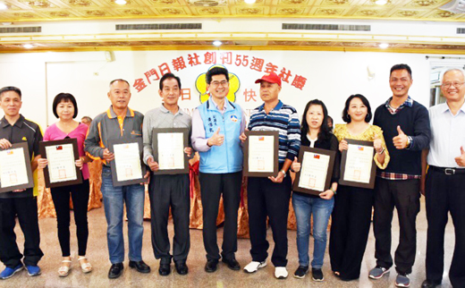 本報於10月31日創社滿55年,報社於昨(30)日提前舉辦社慶慶祝大會,表揚資深員工許績鴻、陳寶玉、蕭宗宇、陳詩平、王根圍、蔡清琦、陳曉琳、陳麗娜、許加泰等人,現場熱鬧非凡。 本報昨日舉辦「創社55週年社慶」活動,於上午前往植物園舉辦員工環境教育,中午舉辦社慶餐會,包括副縣長黃怡凱、縣議員李應文、觀光處長丁健剛、縣府前參議陳炳仁、前社長陳大鵬等人都來到現場,為本報慶生。 昨日社慶同時表揚績優資深員工,包括服務年資40年:許績鴻、陳寶玉、蕭宗宇、陳詩平、王根圍、蔡清琦;服務年資35年:陳曉琳、陳麗娜;服務年資30年:許加泰。 副縣長黃怡凱昨日代表縣長楊鎮浯到場祝福金門日報55週年生日快樂,他說,金門在地人從小都是看金門日報長大,甚至長大到台灣去工作,也是每天都要上金門日報網站看金門的消息、了解家鄉事,也是得知故鄉婚喪喜慶的重要消息管道,如今金門日報也有電子報、即時新聞,一直在進步,看得出大家的努力。 縣議員李應文表示,金門日報站在第一線,報導金門的大小事,現在更進步到用手機也能看,他希望未來能朝向新科技發展,縣議會也會全力支持。 本報社長傅仰土表示,感謝過去曾經為本報服務、貢獻過的前輩們,以及現正在職的工作夥伴,勉勵大家一起加油努力,讓本報越來越好。