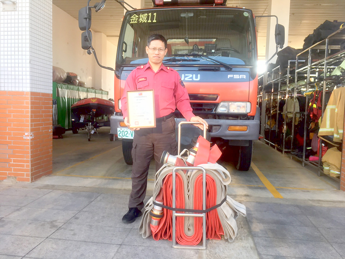 金門縣消防局金城消防分隊李錫安研發的長距離水帶佈線推車,較傳統佈線方式節省約兩倍時間及人力,獲得內政部長徐國勇肯定,並取得專利,更在最近兩起火警中發揮功用。 縣消防局金城消防隊研發消防佈線推車,在去(108)年10月18日內政部徐國勇部長蒞金至金門縣消防局視察,由第一大隊所屬6名人員於局本部進行水帶佈署實兵操演,透過一般佈線與推車佈線進行互相比較,讓部長了解到同仁所自行研發的長距離水帶佈線推車在佈線上的優勢,受到部長相當肯定並鼓勵推廣至各單位使用。為使辛苦研發的成果能受到保障,於是便著手於智慧權專利申請,配合專利商標事務所撰寫專利文件,過程中不斷協調更改相關內容,過程中也跑了幾趟台灣,於109年4月初送件審查,至送審歷經4個多月的審查,終於順利通過形式審查,並刊登於8月份專利通報,獲得新型第599675號專利證書,從研發、設計、製作到專利申請經歷2年多的時間,領證又花了1個多月時間終於在近日完成領證。 李錫安表示,回想當初進行長距離水帶佈線推車研發,係緣自於金城分隊所轄幅員廣闊,老舊街道密佈,狹窄的街道原本車輛就不易通行,又因違規車輛停放,使得消防車輛通行更加困難,此一現象除了有礙市容觀瞻影響生活品質外,也對道路提供應有的防火救災與人車通行功能造成極大衝擊,救災車輛第1時間往往無法順利抵達事故現場,造成執行救災時消防車輛均需佈署於外圍道路,後續再以人力延伸水帶至現場執行災害搶救工作,不但費時又費力,致使救災效率大為不彰,更讓災害搶救工作愈形困難。有鑑於此,消防局第一大隊大隊長陳國瑋為有效執行窄巷救災工作、提升為民服務效能,特指示轄區金城消防分隊研擬因應腹案,主管副大隊長董必文於是便借重小隊長李錫安在研發上的專才,責其帶領徐蒼望等多位同仁集體構思,進行佈線推車的研製。 消防車上放置的水帶收納可以分成單捲、雙捲、Z字型及克里夫蘭捲,針對不同的災害事故地點會選擇使用不同收納方式的水帶,其中單捲及Z字型水帶可以用在垂直或是梯間佈線,克里夫蘭捲會用在入室前的搶救,雙捲水帶大部分用在水平佈署,當消防車輛接近火場1-2條水帶的距離,約20到40米的位置,1個人就可完成2條水帶的佈署,但當消防車停放的位置距離火點超過100米,使用雙捲水帶佈線便需要由2人來執行,過程中會耗掉2分半到3分鐘的時間,這種情形對於分秒必爭的火災現場,耗費的時間越長,危險的程度就會增加,對於救災人員就越不利。經透過收集相關文獻及自身累積的豐富救災經驗,小隊長李錫安著手進行水帶架與水帶車的設計及研發,利用水管做成45cm×20cm×50cm的水帶架,將水帶折成M型裝在水帶架上,2條水帶收成M型,寬度會比ㄇ字型小10公分,透過水帶串連,一次串接6條水帶,再將水帶架裝在推車上,此時所需的推車需要能夠高承重(至少耐重50KG),同時進行佈線測試,將原本佈線時間縮短到1分鐘以內,初期經測試發現水帶架寬度太小,會影響到整理水帶的時間,於是又適度將水帶架的寬度加大5cm,最終將尺寸設定成45cm×25cm×50cm,經測試此設備可由單人操作,約1分鐘可完成6條2又1\2英吋水帶佈署,較傳統佈線方式(3人佈署6條2又1\2英吋水帶所需時間約3分鐘),可節省約2倍時間及人力,且救災過程不致於因緊張造成公母接頭錯接,而延誤救災,有效大幅提升佈署效率。 目前消防局已正式在轄區有窄巷需長距離佈線需求的金城、金寧及金湖消防分隊車組上配置有此長距離水帶佈線推車,正式加入救災行列。而自將此長距離水帶佈線車列為隨車救災裝備後,在金城鎮光前路00號民宅火警案及金城鎮珠浦南路00號前汽車火警搶救案均發揮出重要貢獻,該二起案件均位處巷弄狹小消防車無法進入地點,快速水帶佈線車發揮快速佈線功效,讓消防搶救工作變得更加快速順利,有效減少民眾生命財產損失。 金門縣消防局長翁宗堯表示,第一大隊身處城區市中心,負責守護城區公共安全,以轄區遇到的救災困境,透過實際的創意發想,改善現有的救災裝備,提升救災效能相當值得肯定,也藉此期勉同仁遇到問題都要有面對的勇氣,然後思考解決的方案,將問題化解,如此將能有效守護縣民生命財產安全。