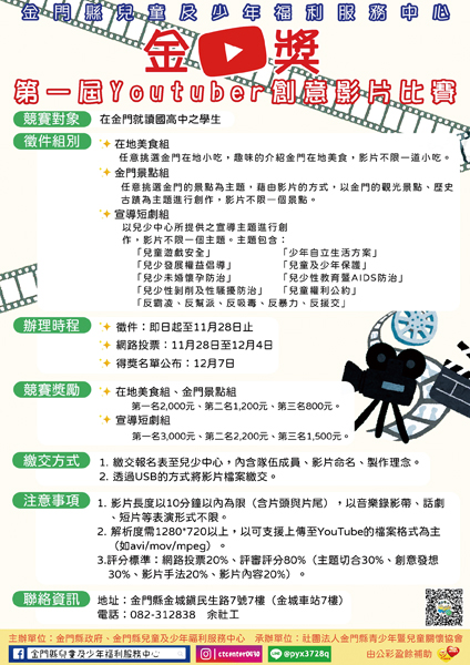 金門縣兒童及少年福利服務中心辦理「創意影片製作競賽」,競賽主題共分為「在地美食組」、「金門景點組」及「宣導短劇組」,並自即日起至11月28日止徵件,歡迎各路好手來報名參加,獲勝者有機會將獎金帶回家。 「創意影片製作競賽」,由金門縣政府、金門縣兒童及少年福利服務中心主辦,社團法人金門縣青少年暨兒童關懷協會承辦,公益彩券盈餘補助。競賽主題共分為「在地美食組」、「金門景點組」及「宣導短劇組」,少年們可以自行選擇參賽的組別,並發揮創意用影片呈現自己的理念,影片徵集即日起至11月28日止,歡迎各路好手報名參加。 金門縣兒童及少年福利服務中心表示,此次活動主要結合現今兒童及少年流行的議題,將Youtuber的概念融入至活動中。讓少年們發揮創意與巧思,進行自我挑戰。也希望透過影片製作競賽,讓兒童及少年們體驗當Youtuber的感覺,了解這份新興行業是否與想像中相同。而此次獲勝的影片將會有機會將獎金帶回家。 金門縣兒童及少年福利服務中心位於金城車站七樓,開放時間為每週二到每週六,早上九點至中午十二點、下午一點半至六點半。平時開放十八歲以下之兒童與少年來中心休息、玩耍,中心備有許多漫畫小說、玩具、桌遊等,也供有免費的wifi給兒少們使用。除此之外,中心辦理許多活動,歡迎民眾洽該中心臉書粉專、LINE@等查詢相關資料。而兒童及少年在求學的過程中,如遇家庭關係、同儕關係、課業壓力等,都可以至兒少中心尋求社工協助,諮詢電話082-312838。