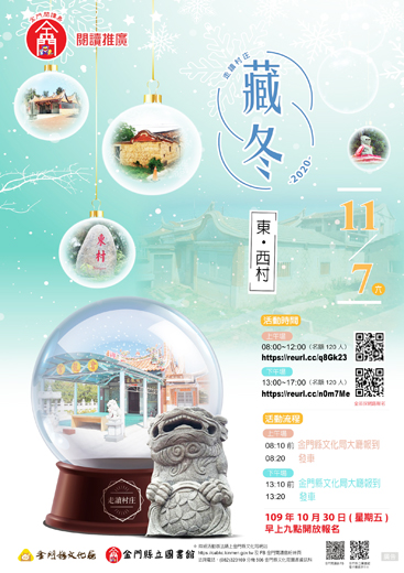 金門縣文化局為推廣閱讀,辦理「四季走讀—走讀最美的村庄」系列活動,第四季藏冬,地點選在金門最東邊的兩個小村庄:西村、東村,預訂於109年11月7日登場。 本次活動分為上、下午時段兩梯次,將邀請黃振良、陳炳容、陳成基等文史工作者導覽,10月30日(星期五)早上九點開放網路報名,每梯次各限額120人,歡迎有興趣民眾踴躍報名參加。 文化局表示,「四季走讀—走讀最美的村庄」系列活動—藏冬共計兩梯次,第一梯11月7日上午,活動時間上午梯次為08:00至12:00,參加人員請於8:10前於文化局大門口辦理報到,08:20準時搭乘遊覽車出發;第二梯11月7日下午13:00至17:00,參加人員請於13:10於文化局大門口辦理報到,13:20準時搭乘遊覽車出發。報到敬請準時,逾時不候。本次保留西、東村村民上、下午梯次各5位名額(憑身分證住址)電話報名。 藏冬路線規劃為:西村保蓮廟→呂氏家廟→東、西村聚落→東村滄龍宮→縣定古蹟呂朝怡洋樓→歷史建築呂克瓶古厝→縣定古蹟呂世宜古厝→土樓保安殿→東村石敢當與風獅爺。將邀請黃振良、陳炳容、陳成基等在地知名文史工作者,擔任隨隊沿途講解。 本次活動採用網路報名,對象限7歲(含)以上且能隨導讀團隊行走讀者報名參加,如有7歲以下兒童需有家長陪伴。每人限報一梯,不得重複報名;上網報名一次只能報名一位,無故報名未到者,列為記點,下次活動報名將受限。活動採網路報名,請上金門縣文化局網站—閱讀推廣—「四季走讀—走讀最美的村庄—藏冬」。上午場報名網址:https://reurl.cc/q8Gk23,下午場報名網址:https://reurl.cc/n0m7Me,電話洽詢專線:082-323169轉506。 西村、東村主要以呂姓為主,呂氏在金門的開基算是較早的宗族之一,從北宋時呂氏天恩房十世孫法溪、璧溪兄弟移居浯江,到呂氏天申房裔孫惠卿號藩溪之子克椿,住浯江「東倉」,之後子孫繁衍,都在金門東部海岸從料羅到溪邊一帶。這大片土質都是砂地,又是東北季風最強勁的地區,所依賴者都是靠海維生,生活困苦尤甚於其他各村落。今日的東村、西村,村名相傳與其祖籍地南安縣樸兜的「西倉甲」有關。 文化局指示,該局圖資科從105年開始推動大家來寫村史,以淺顯易懂的白話文,生動地刻畫出村里特色,吸引年輕人閱讀,關心自己生長的環境,並搭配「四季走讀—走讀最美的村庄」閱讀推廣活動,邀請大家一起走訪每個村落在地歷史,歡迎大家多到金門縣立圖書館借書閱讀及參與。 文化局特別提醒,為配合中央及金門縣政府防疫措施,參與民眾請配戴口罩,若有出現發燒、咳嗽請於活動前取消報名。活動路線和相關訊息請上金門閱讀島FB臉書。