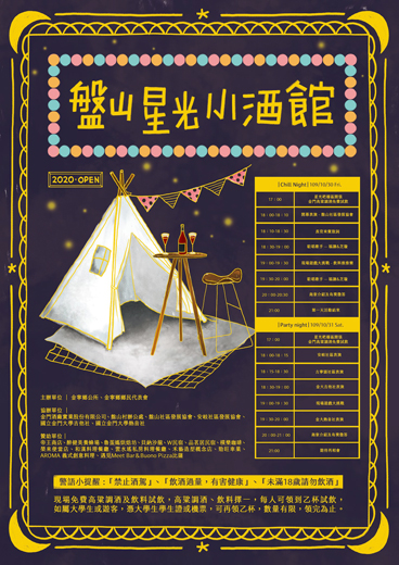 金門縣金寧鄉2020盤山「星光小酒館」活動是金寧鄉公所結合盤山在地商家、金門大學觀光系所舉辦品酒、聽音樂放鬆的活動,也是金寧鄉創新舉行的活動,時間訂於今日、明日下午五時起開始,地點於金寧鄉盤山村頂堡彩繪水溝(網紅景點:為什麼來金門?)。 金寧鄉公所表示該活動與以往不同,以聽聽chill音樂、喝點小酒,讓大家感受放鬆放空氛圍,主打現場免費高粱調酒及飲料試飲,高粱調酒及飲料擇一,每人可領到乙杯試飲,如屬大學生或遊客,憑大學生學生證或機票,可再領乙杯,數量有限,領完為止。 在活動的這二天,只要在現場打卡,即送盤山在地商家折價券,活動中將進行互動小遊戲,有推飲料挑戰、趣味保齡球挑戰,挑戰成功者即可獲得啤酒乙罐,也有適合小朋友的推可樂挑戰,歡迎大小朋友一起來挑戰。 晚上八點,公所將介紹贊助在地商家,並進行有獎徵答,獎項十分豐富切勿錯過,獎品數量有限,送完為止。 ◎警語小提醒:「禁止酒駕」、「飲酒過量,有害健康」、「未滿18歲請勿飲酒」。