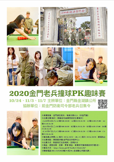 金湖鎮公所為配合縣政府老兵召集令活動,與前金防部老兵召集令團體合辦老兵回金門系列活動,並於第一階段10月19日至25日、第二階段11月1日至9日在金湖鎮籃球場辦理刺槍術、軍歌演唱、老兵撞球賽比賽、老兵尋人、事、物啟事等系列活動,第一階段已有500人次參加活動,歡迎大家來參加第二階段活動。 金湖鎮長陳文顧表示,早期金門曾經擁有10萬大軍在金門島上活動,金湖新市商圈在當年可是擁有金門西門町之稱的鬧區,鎮長陳文顧希望藉由老兵召集令活動,除了吸引老兵回來金湖鎮走走看看外,另外還特別加碼籌劃出系列活2020金門老兵撞球PK趣味賽及2020金門老兵尋人啟事活動。 金湖鎮公所表示,老兵撞球賽比賽日期為10月24日、11月3日、11月7日,每日分4場次舉行,將頒發每梯次冠、亞、季、殿錦旗一面及參賽者皆可獲得精美伴手禮一份。 另外,鎮公所將於11月7日下午2時邀請金門自衛隊至金湖鎮籃球場協助演出,歡迎大家來參加活動。 另外,老兵尋人、事、物啟事,於即日起至12月15日將由金湖鎮公所協助安排專人專車服務,(協尋範圍:金東師、南雄師、金中師、限金湖鎮8個里)帶返金老兵去想回味的地方或者協尋當年在金門當兵的老友。