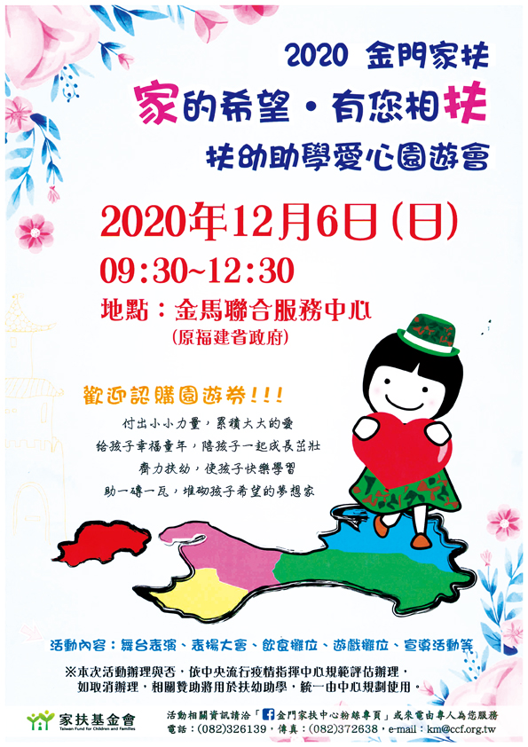 2020年金門家扶中心寒冬送暖園遊會開始招募攤位! 2020金門家扶中心「家的希望.有您相扶」扶幼助學愛心園遊會,訂於12月6日在金馬聯合服務中心(原福建省政府)前廣場舉辦,預計籌募愛心攤位、政令服務宣導攤共計60個攤位。 本次扶幼助學愛心園遊會訂有各項響應協助之辦法,包括冠名贊助愛心攤位、個人或團體贊助、認購實物禮券協助弱勢家庭等各種方式,歡迎各界共襄盛舉給與金門弱勢兒童及其家庭,能度過一個溫暖的寒冬。 金門家扶中心表示,為感謝民眾對園遊會活動支持和參與,凡贊助活動三千元以上即贈「家扶迷彩小書包」一個。金門家扶中心邀請社會大眾為弱勢家庭及兒童盡一份心力,愛心園遊會洽詢電話(082)-326139。 金門家扶中心籌劃將於12月6日(星期日)辦理「2020年『家的希望‧有您相扶』扶幼助學愛心園遊會」活動,邀集各界設攤報名,園遊會所獲全數收入,將全數做為金門地區弱勢兒童的扶幼助學服務之推動。若有協助設立愛心攤位意願者,請來電聯繫,將由專人與您聯繫接洽。除美食攤位之外,另招募各機關團體的「業務宣導攤位」,每攤需繳納3,500元的攤位架設成本費用,歡迎民眾與各界機關團體踴躍參與。 金門家扶中心表示,本次扶幼助學愛心園遊會訂有各項支持本活動的辦法,包含:一、協助六萬元以上即列為本活動之「協辦單位」並致贈感謝牌一面。二、協助三萬元以上即列為本活動之「贊助單位」並致贈感謝牌一面。三、認養愛心攤位並冠名贊助,每攤一萬元贊助中心設攤經營,當天於攤位上冠名列出贊助者或單位之大德芳名。四、認養弱勢家庭的實物禮券每份一千五百元,將由中心統一購買禮券贈與受扶助家庭,用來採購生活用品及家庭所需,以減輕家中的經濟負擔,讓孩童們可以安心學習及成長。家扶中心目前服務約225戶的家庭,希望每一個家庭都能得到實物禮券的協助。 除了上述活動支持辦法外,有意協助家扶中心之贊助者,歡迎親臨金門家扶中心或利用各種方式進行園遊會活動費用的贊助,以及利用郵政劃撥帳號17457741的方式亦可。在收到各項贊助後即刻開立收據,同時會在活動現場、金門家扶中心之官方網站或臉書社群軟體上,刊登公告芳名以徵信。金門家扶中心推動金門在地弱勢兒童及家庭的照顧工作,需要您出手相助,為每一個家庭的寒冬,獻上有溫度的關懷。 這場愛心園遊會將於12月6日上午九時三十分至十二時三十分在金馬聯合服務中心前廣場舉辦,當天規劃至少60個吃喝玩樂攤位、業務宣導攤位、精彩表演、表揚活動,目前極需各界愛心支持與認養愛心攤位。 家扶中心鼓勵大家預購當日的園遊券,一同響應及支持愛心園遊會活動,園遊券即日起可至家扶中心認購,每張面額一百元,單筆購買一千元(含)以上,贈迷彩愛心存錢筒一只,數量有限贈完為止。本活動進行亦將依中央流行疫情指揮中心指示辦理,隨時關注金門家扶中心FB粉絲專頁、官方網站,最新消息不錯過,親子一起逛園遊會,順手幫助弱勢家庭做愛心。