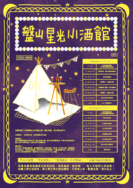 來喝一杯吧,金門縣金寧鄉2020盤山「星光小酒館」活動起跑囉!金寧鄉2020盤山「星光小酒館」活動是金寧鄉公所結合盤山在地商家、金門大學學生社團所舉辦品酒、聽音樂放鬆的活動,也是金寧鄉創新舉行的活動,時間訂於10月30、31日下午17時起開始,於金寧鄉盤山村頂堡彩繪水溝(網紅景點:為什麼來金門?)。 金寧鄉公所表示,該活動與以往不同,以聽聽chill音樂、喝點小酒,讓大家感受放鬆放空氛圍,主打現場免費高粱調酒及飲料試飲,高粱調酒及飲料擇一,每人可領到乙杯試飲,如屬大學生或遊客,憑大學生學生證或機票,可再領乙杯,數量有限,領完為止。現場提供免費調酒及飲料試飲。 二天活動中只要在現場打卡,即送盤山在地商家折價券,活動中將進行互動小遊戲,有推啤酒挑戰,挑戰成功者即可獲得啤酒乙罐,也有適合小朋友的推可樂挑戰,歡迎大小朋友一起來挑戰,晚上20時,公所將介紹贊助在地商家,並進行有獎徵答,獎項十分豐富切勿錯過,以上獎品數量有限送完為止。 公所表示,其中熟食區目前規劃招商中,以炸物、燒烤、點心類為主,即日起請攜帶身分證件至公所報名,視報名情況增減攤位,該區每攤提供插座(攤商需先提出需求如電壓110V或220V、瓦特)、1長桌2椅,詳情可電洽金寧鄉公所農觀課(082-325-610)。 【未滿18歲請勿飲酒】