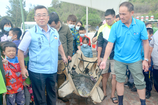 今年9月初在小金門擱淺受傷獲救的綠蠵龜,在金門縣水試所及野生動物保育救援協會悉心照顧後,昨日在成功海岸野放,順利返回大海。 金門縣水產試驗所與金門縣野生動物救援暨保育協會,昨日午後在成功沙灘辦理海龜野放活動,由金門縣政府秘書長陳朝金帶領正義國小全校師生及在地鄉親,在岸巡的戒護下將綠蠵龜送到海邊,一同目送恢復健康的綠蠵龜回到大海的懷抱。 水試所指出,此次野放的綠蠵龜於109年9月5日在烈嶼中墩沙岸擱淺,是近年金門救援案例中第一隻成體公綠蠵龜,為了讓海洋動物落難時得以順利救援,從岸巡人員接獲通報之始,便啟動海保署救援網(MARN)救援行動,由縣府、水試所及金門野保協會合力救援,為了讓海龜得到專業的醫療照護,當日決議後送水試所場地救援處置。水試所表示,這一隻綠蠵龜,經協會獸醫檢傷該龜體態良好,形質測量結果:背甲直線長約80公分,尾長約20公分,體重約60公斤。外觀除頭部可見一凹陷舊傷外無明顯外傷,背甲中央可見有許多藤壺附生,抽血結果肌肉指數偏高,顯示有肌肉損傷跡象,另照養數周後於頸部與前肢交界處皮膚,可見環繞狀之脫落樣傷痂。經輸液補充脫水並給予藥物進行治療數周後,協會獸醫及照養員每日觀察並記錄其活動力及食慾,起初海龜生命跡象穩定,但是食慾及活力皆不佳,會漂浮在水面上無法順利下潛,約治療2周左右始正常下潛,並有正常排便,游動能力及食慾也漸入佳境,近日經評估後達野放標準,野放前於後鰭狀肢各打上鐵標(TW5070、TW5071),讓未來可以透過標號進行通報及研究,追蹤海龜的去向。 野放活動由海龜保育推廣揭開序幕。隨即,由秘書長陳朝金和水試所工作人員合抬海龜送至沙灘上。海龜甫接觸沙地還不習慣,等待一會兒才奮力游向大海,在場的正義國小師生與民眾不禁發出驚呼。 陳朝金秘書長在野放前為小朋友上了一堂保育課,陳朝金指出,學者調查每年有一千兩百七十萬公噸的垃圾從陸地上丟棄到海洋裡,其中有百分之九十四的垃圾沉到海底,有百分之六垃圾隨著海流又漂向岸際,對海洋生物造成極大的生存威脅,從許多野生動物死亡解剖,都發現胃中有大量誤食的海洋垃圾。他呼籲大家應發揮個人的力量,影響鄰居、朋友,不要再讓這些垃圾流入海洋,唯有靠大家來體恤野生動物的生存不易,共同做到保護海洋的責任,減少生物滅絕。 水試所指出,除了海龜之外,今年也遇到了第1起活體鯨豚醫療照護的案例,這意味著發展在地海洋動物擱淺收容中心有其必要性,因此水試所未來也會將收容中心的軟硬體發展列入規劃,讓金門能夠建構出對海洋野生動物更友善的環境。