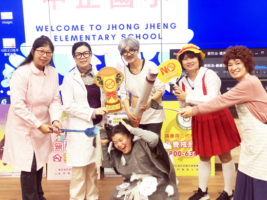中正國小與本縣衛生局日前在該校視聽教室辦理兩場「菸害防制話劇-丸子大戰香『煙』人」宣導活動,由校長蔡雪芳主持,衛生組配合二年級的健康課程,邀請該校愛心志工家長透過生動的菸害防制話劇教導孩子如何拒絕菸害,促進家庭健康。 中正國小與衛生局聯合辦理菸害防制宣導活動,結合話劇演出「丸子大戰香『煙』人」,透過香「煙」人的角色,讓學生了解吸菸不僅對吸菸者的健康產生危害,吸菸時所產生俗稱「二手菸」的煙霧含有尼古丁、焦油、一氧化碳、亞硝胺等數十種刺激物質,及四十種以上的致癌物與有害化學物質,小朋友吸了容易得到氣喘等呼吸道疾病,成人如果長期暴露在二手菸下,不僅會造成如支氣管炎和肺氣腫的胸腔問題和心臟病外,還會增加罹患肺癌的危險。 劇中,大丸子的爺爺為了孫子及全家人的健康,下定決心要戒菸,卻不得其法,差點破戒,於是大丸子陪同爺爺,前往附近的診所、藥局,利用既便利又多元化的戒菸管道戒菸,最後終於戒菸成功。 衛生組陳映先老師表示,自從「菸害防制法」公佈實施後,許多公共場所雖已普遍禁菸,但許多家庭成員依然讓學童暴露在二手菸的環境中。吸菸對健康的危害甚鉅,為了讓孩子能擁有一個乾淨安全的家庭,因此利用戲劇情節,透過小朋友鼓勵家人共同來實踐「健康無菸家庭」運動。兩個場次下來,小朋友的反應都非常熱烈,還有小孩回家後寫信給爺爺,建議他到運動場動一動,減少吸菸的機會。 中正國小蔡雪芳校長希望孩子能經由話劇演出,在快樂學習的氣氛中,除了知道菸害防制的重要性之外,更能身體力行,抵擋吸菸的誘惑,關心自己也關心別人,每個人都有自我健康管理的決心,成為拒絕吸菸並勸導別人不吸菸的「無菸健康小尖兵」。 本縣共有17家合約醫療院所及社區藥局,提供二代戒菸用藥或衛教服務。同時也可以撥打免費戒菸專線0800-636363,三管齊下能更輕鬆成功戒菸。