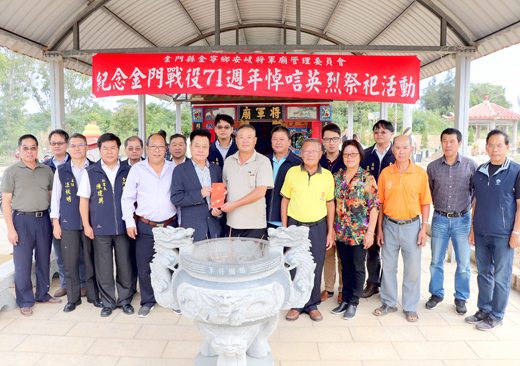 金寧鄉安岐「將軍廟」神誕祭祀日,為每年的農曆九月初三,將軍廟管理委員會於昨(19)日舉行「紀念金門戰役71週年悼唁英烈祭祀活動」,金門縣議會議長洪允典率領議員與議會主管前往參拜,悼念當年因古寧頭戰役身亡的英勇將士,表達敬意並祈求兩岸和平共處、人民安居樂業! 議長洪允典昨日下午偕同議員楊永立、王碧珍、陳志龍,在議會秘書長陳建興、議事主任陳勵志、法制主任吳鎔銘、總務主任王垣坤、會計主任汪秋明及人事管理員翁文明、秘書陳成勇等人陪同下,前往位於安岐的將軍廟秉著虔誠的心,遵循祭拜儀式向因戰役壯烈犧牲的將士上香,並向英勇將士靈位行三鞠躬禮,表達崇高的敬意,場面莊嚴肅穆。 議會表示,民國三十八年古寧頭登陸戰從安岐附近海灘拉開序幕,當時駐守在安岐村外的部隊守軍首當其衝,村民為感念在此戰役中壯烈成仁的戰士們,讓戰亡的英靈有一葬身處所與祈求地方安定,乃在其殉職處建廟曰將軍廟,奉祀鎮國將軍之英靈,當地居民每逢農曆九月初三也都會準備祭品到將軍廟祭祀參拜致敬,悼念其犧牲奉獻的精神。
