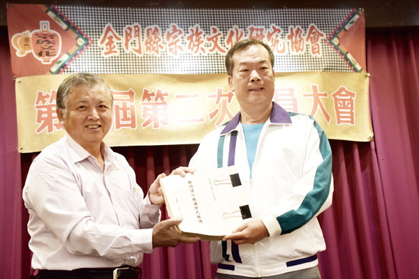 金門縣宗族文化研究協會昨日舉辦第六屆第二次會員大會,會中除討論通過多項提案,並頒發理監事與幹部證書,重頭戲是由創會理事長黃奕展將「銀同浯江珠浦許氏族譜」送還給許氏宗親保存,金門縣許氏宗親會理事長許秋霖表達萬分感謝。 金門縣宗族文化研究協會舉辦第六屆第二次會員大會於昨日晚間五時許舉行,由理事長葉鈞培主持,縣府社會處副處長李廣榮代表楊縣長前往觀禮祝福,並頒發理事長證書給予葉鈞培。該會會員與理監事及顧問到場與會。 金門縣宗族文化研究協會昨日頒發新任第六屆理監事分別為:理事長:葉鈞培。理事:方駿洋、王先正、王建成、王添泉、何炯輝、李仁木、李榮協、翁文貴、陳木漳、葉維誠。常務監事:盧懷琪、徐鴻義、陳為學。 昨日聘請顧問也頒發聘任證書,分別是江柏煒、吳有家、呂玉林、呂瑞泰、李誠智、林再求、洪允典、孫國欽、孫國粹、張吟音、陳文顧、陳聰泉、葉天仁、蔡乃靖、蔡西湖、蔡其雍、盧根陣、張璋全、陳為庸、洪憶青等人。 昨日重頭戲是由創會理事長黃奕展將「銀同浯江珠浦許氏族譜」送還給許氏宗親保存,金門縣許氏宗親會理事長許秋霖表達萬分感謝。黃奕展表示,族譜是宗族人口記錄和家譜有密切關係,該協會長期關注各姓祖譜,對其保存更是重視,這次對於金門長期修譜的長者許嘉立收集的族譜,而其生前對族譜收集推廣更是不餘遺力,而且生前也表示要將族譜手抄本捐給金門縣宗族文化研究協會,創會長黃奕展認為族譜為期一生心血不忍接受。 黃奕展說,金門縣宗族文化研究協會對於族譜、墓園、宗祠相當重視,年前也完成金門各族宗祠一百九十四間,其內容也在覺民堂展出。其間對各氏族譜收集原則是手抄本一概不接收,因手抄本是各宗族重要資產,該會只接受影印本的族譜。