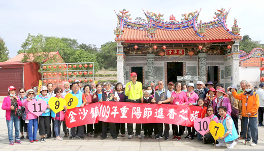 金沙鎮公所昨舉辦「109年度重陽節進香活動」,全鎮8個里共計有476位長者參加,分別前往田浦泰山廟、新頭伍德宮、料羅順濟宮等宮廟進香祈福,中午並於昇恆昌歡聚聯誼及為10月生日的壽星慶生。鎮長吳有家、議員李應文、王秀玉、代表黃奕焮、蔡寶愛、呂寶玉等也到場向長者祝壽及賀節。 金沙鎮公所「109年度重陽節進香活動」昨日舉行,與會476位長者分別搭乘遊覽車進香出遊,除了汶沙里於沙美車站集合外,今年也特別商請遊覽車至各里搭載與會長者,總共15台遊覽車,兵分3路前往田浦泰山廟、新湖漁港慈鑾宮、新頭伍德宮、料羅順濟宮等宮廟進香祈福,並至料羅媽祖公園參觀,難得出遊,長者開心不已! 在結束進香行程後,與會長者,社福志工,工作人員、里長等,昨日中午齊聚昇恆昌餐聚聯誼,鎮長吳有家並特別準備生日蛋糕為十月壽星慶生,現場包括議員王秀玉、李應文、鎮代表蔡寶愛、黃奕焮、呂寶玉等也到場,向長者賀節及祝壽。 鎮長吳有家表示,進香活動在各里長、社福志工隊及鎮公所工作同仁努力下,順利圓滿。這次為方便老人家參與活動,首次到各里接送,情況和秩序良好。今年非常高興能再次和所有長者於活動中相見歡,九九重陽節是屬於所有長者的日子,公所透過活動向長者聊表心意,而公所也致力於落實各項老人照顧,目的是讓長輩們生活得安心、子女放心,並能夠無後顧之憂教養子女及在工作崗位上發揮,希望與所有長者相約,明年再相會。 吳有家說,自去年九九重陽節推出以「福、祿、壽、喜」作為設計主題之重陽節紀念酒,延續去年的「福」字主題,今年主題則為「祿」。紀念酒正在製作中,預計於10月22日發放,相關訊息下星期將會再另行公告,也祝福鄉親九九重陽節快樂,身體健康。