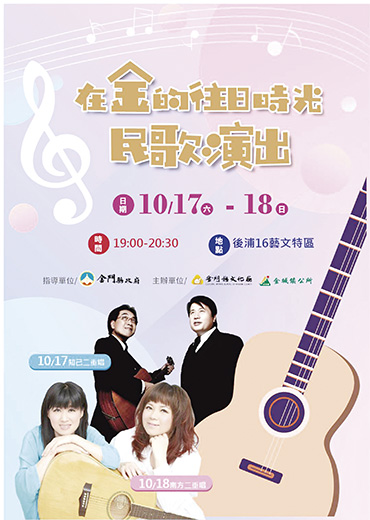 金門縣文化局與金城鎮公所合作,將於10月17、18日,兩日晚間7點到8點30分,在後浦16藝文特區舉行「在金的往日時光-民歌演出」,兩晚分別邀請知名民歌團體「知己合唱團」以及「南方二重唱」登臺演唱,歡迎民眾前往欣賞。 金門縣文化局表示,以往表演藝術活動多是在演藝廳室內舉辦。此次演出與金城鎮公所合作,將舞台拉到市中心的「後浦16藝文特區」,就是期望藉由民歌明星加持,讓更多民眾能就近享受藝文活動之外,藉由人潮亦可以活絡地區附近商家。 此次演出於17日邀請「知己二重唱」;18日邀請「南方二重唱」進行演出,將演唱夢田、木棉道、橄欖樹等多首膾炙人口的民歌,希望藉由民歌的雋永旋律和他們扣人心弦的歌聲,讓觀眾重新回味當年民歌的盛況。 文化局提醒到場看演出的鄉親,此為免票觀賞之演出,因應疫情,請全程配合配戴口罩觀賞。