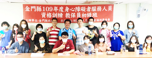 金門縣政府昨日正式在福田家園辦理109年度身心障礙者服務人員資格「教保員初級班」培訓,縣府社會處長董燊特地前往勉勵參訓學員,並表示依照「身心障礙福利機構設施及人員配置標準」法規規定,身心障礙服務單位須聘僱教保員負責訓練及照顧工作,且教保員資格須透過專業認證才可以受聘;縣內的老人及身心障礙人口數多,加上縣內持續推動社區式身心障礙服務,現行招募教保員之服務單位已越來越多,因此再三鼓勵學員堅持到底,完成本訓練,增加自己的專業技能,未來持續關注各類身心障礙服務單位徵才消息,投身從事教保員工作。 社會處指出,縣長楊鎮浯非常重視縣內身心障礙相關政策發展,除了現行的現金補助外,也非常關注實務上的福利服務提供。今年下半年縣內身心障礙福利服務已陸續開拓許多社區式福利服務項目,包括日間作業設施、日間佈建、社區居住及家庭托顧,為的就是讓身心障礙者可以有更多元服務可以選擇,協助身心障礙者有品質的在社區中生活。 社會處表示,本次教保員初級班訓練內容包括「核心課程」56小時及「實習」34小時,合計90小時。開訓第一堂課由國立金門大學社會工作學系助理教授邱泯科擔任講師,講授身心障礙福利政策及法規課程,緊接著有其他專業講師及系列課程,增加學員們的學識知能,實習課程則會有實習指導員,督導學員實際參與福田家園園生訓練及照顧工作,方便實務操作,學以致用。