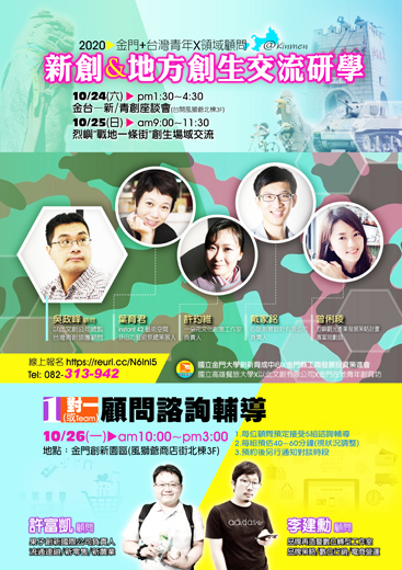 國立金門大學創新育成中心將在10月24日(週六)至26日(週一)舉辦「金門新創暨地方創生交流研學」活動,邀請台灣新創家、地方創生經營者及領域顧問等共計九人,來金門與在地青年進行三天兩夜的研討與交流研學活動;歡迎在地青年及有興趣的鄉親踴躍參與,報名電話:(082)313-942金大育成中心或線上報名:https://reurl.cc/N6lnl5。 這項研學活動由金門縣工商發展投資策進會共同主辦,國立高雄餐旅大學、以此文創有限公司及金門在地青年創育坊協辦,目的係為促進在地青年與台灣新創夥伴及領域顧問進行交流互動,活動聚焦在新創(或有意創業)及地方創生為研學主題,期透過個案分享、問題研討、腦力激盪與實地參訪等,達到共創良好創業與創生環境之目的。 活動將於24日(週六)下午1時30分至4時30分在台開北棟3樓登場辦理研討會,由台灣地方創生經營者及領域顧問分享相關推動案例,並與金門在地青年進行交流對話。與會分享者來自台中以此文創公司吳政峰總監、台中心詠創意設計公司戴家銘執行長、彰化instant 42藝術空間葉育君執行長、台南一朵花文創工作室許玓維執行長、高雄餐旅大學觀光所曾俐綾專案規劃師、台灣連鎖加盟創業知識協會林淑華、陳嘉璇顧問,以及許富凱、李建勳等兩位金大育成中心顧問。 25日(週日)上午9時至11時一行人將移師烈嶼鄉西方社區,參訪正在規劃中的「戰地一條街」場域,由國立高雄餐旅大學駐地團隊接待解說及交流。26日(週一)上午10時起至下午3時再安排於台開北棟3樓進行「一對一(或Team)顧問諮詢輔導」,由金大育成中心許富凱(流通連鎖、新零售)及李建勳(品牌、數位及電商)兩位顧問接受各5組諮詢,每組進行40~60分鐘,有興趣者請務必報名以便安排對談時段。