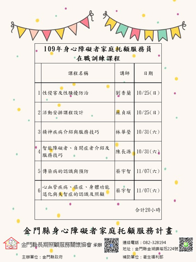 金門縣政府為培訓身心障礙者家庭托顧服務儲備人力並提升服務品質,將辦理「109年身心障礙者家庭托顧服務員在職訓練」,預計今年培訓金門地區身心障礙者家庭托顧服務員20位投入該項服務,報名截止為10月16日或額滿為止,歡迎具有身心障礙福利機構教保員、訓練員、生活服務員、照顧服務員、家庭托顧服務員其中一項資格者踴躍報名參訓。 縣府社會處指出,「身心障礙者家庭托顧服務員在職訓練」由金門縣政府補助金門縣長期照顧服務關懷協會辦理,辦理訓練時間為10月25日、31日與11月7日,共計3天課程。 地點分別於金門縣政府新聞發佈室(10\25)及多媒體簡報室(10\31、11\07),課程總時數共計20小時。如參訓學員為長照服務人員(請事先告知承辦單位),將協助申請長照服務人員繼續教育積分認證。本課程自即日起受理報名,請於上午08:00至12:00、下午13:30至17:30逕洽協會黃先生報名,聯絡電話:082-328194。 社會處表示,家庭托顧服務如同是一種請保母的照顧服務模式,是將家中年滿18歲以上的身心障礙者送至鄰近的家托員家中,於白天接受照顧,如同在家庭一般的生活照顧,減少家庭照顧者的壓力,讓身障者在社區生活,接受去機構化的社區式照顧服務。 社會處指出,本縣推動身心障礙者之照顧服務模式,除了居家服務、日間照顧服務外,面對身心障礙者需要多元的新型服務照顧模式,讓需要照顧者的家庭及個人有不同的選擇提升照顧品質,也讓培訓的照顧服務人力投入照顧市場以增加就業機會。期許家庭托顧服務員的培訓讓本縣的照顧服務人力更臻完備,使本縣的身心障礙者享有多元化的服務與照顧。