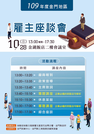 企業必備勞動法令大解析!勞動部金門就業中心結合本縣工商發展投資策進會,將於10月28日下午一時至五時三十分,假金湖飯店二樓會議室(金門縣金湖鎮太湖路二段218號)舉辦「109年度金門地區雇主座談會」。除了就勞動部各項就業促進措施進行宣導外,希望能透過本次座談會,了解地區雇主在徵才、育才、穩定就業、勞資和諧等議題上的需求與建議,作為後續予就業中心求才服務精進作為的目標方向。 本次座談會中特邀請勞基法與勞動契約專家—徐啟勝老師,主講「企業必備勞動法令解析」,將從勞基法規範帶入實例,針對常見問題加以說明,尤其是因應新冠肺炎,調整勞動條件應注意哪些事項?以避免觸法及造成勞資糾紛。另外討論企業人力資源的運用與調整,在徵才、育才時,如何維護勞動權益,促進勞雇雙方和諧,達到留才的好效果。 勞動部金門就業中心張哲銓主任表示本次活動完全免費,即日起報名至10月22日,歡迎各公司行號或單位負責人、管理階層、人資夥伴等踴躍參與講座,有意報名者,可自線上填寫表單https://forms.gle/5UfTWDUupevmiUhN9報名。企業主有任何求才需求或想了解各式僱用方案,歡迎洽詢金門就業中心電話:082-311119分機8113陳小姐、分機8115吳小姐,竭誠為您服務。