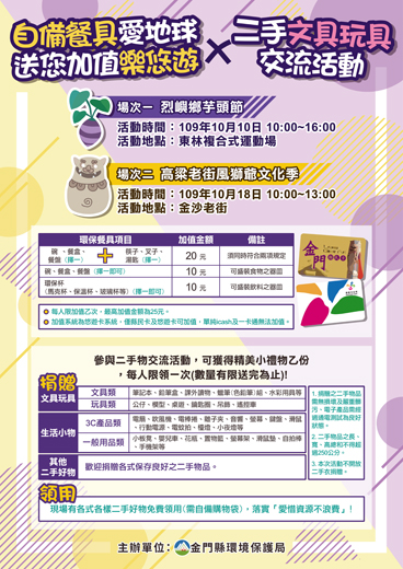 為鼓勵民眾外出活動自備環保餐具,減少使用一次性餐具使用,金門縣環保局於10月期間配合縣內大型活動辦理2場「自備餐具愛地球 送您加值樂悠遊」活動,這2場次的時間及地點分別為10月10日上午10時至下午4時烈嶼鄉芋頭季活動地點(烈嶼鄉東林複合運動場)及10月18日10時至下午1時金沙鎮高粱老街風獅爺文化季活動地點(金沙老街)。 環保局表示,民眾在「自備餐具愛地球 送您加值樂悠遊」活動辦理時間內自備環保餐具(碗、餐盒、餐盤、筷子、叉子、湯匙、杯)至活動現場消費飲食就可獲得不同金額的加值金(自備碗、餐盒、餐盤(擇一)及筷子、叉子、湯匙(擇一),可加值20元;自備碗、餐盒、餐盤(擇一即可)可加值10元;自備環保杯(馬克杯、保溫杯、隨行杯、玻璃杯等,可加值10元),每人限加值乙次,最高加值金額為25元,加值系統為悠遊卡系統,僅縣民卡及悠遊卡可加值,單純icash及一卡通無法加值。 另為促進本縣二手物品流通及推廣愛物惜物、資源循環之觀念,環保局亦於同一時間辦理「二手文具玩具交流活動」,歡迎捐贈二手文具玩具(如:筆記本、鉛筆盒、模型、公仔、桌遊等各式二手物品),現場也有各式各樣二手好物開放領用(請自備環保袋),而現場參與本次二手物交流活動,可獲得精美小禮物乙份,每人限領一次(數量有限送完為止)。
