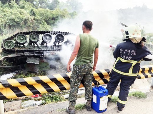 金防部烈嶼守備大隊戰車連昨日下午進行操演時發生戰車翻覆後摔落邊坡意外,竄出猛烈火勢,造成士官一死一傷。金防部指出,單位案發後已聯繫家屬;此外,配合司令部專案小組進行肇因釐清,並配合檢警調查。 烈嶼守備大隊戰車連一輛M41A3戰車,昨日下午2點30分進行「聯合反登陸操演」,戰車連當中的一輛戰車行經黃厝路的一處下坡路段時,撞擊電線桿後發生向田園翻覆,摔落邊坡,消防局指揮中心接獲報案,立即派遣轄區烈嶼消防分隊前往搶救,並由小隊長李岳峰擔任指揮官,總計出動消防車3輛、救助器材車1輛、救護車1輛、消防人員及義消共10名前往搶救。 烈嶼分隊指出,車組抵達現場之後,已見戰車全面燃燒,警義消佈署水線先行壓制,並詢問現場軍方關係人表示有1位同袍受困戰車下,其餘人員均已撤出,但其中一位遭吸入性嗆傷,生命徵象穩定。另由隊員李延達在水線掩護下同步嘗試接近並評估受困士兵,經初步評估已無生命徵象呈現OHCA狀況,且其右腳因遭戰車壓住,無法立即脫困。現場受戰車燃油外溢影響,火勢猛烈,著實危險,小隊長李岳峰立即指派同仁備妥泡沫原液,改實施泡沫滅火戰術,並回報指揮中心請求加派重機械支援。在兩條泡沫水線壓制之下,火勢於15時38分控制,15時47分完全撲滅。 這起事故,受困的中士車長林楷強,送醫不治死亡,下士駕駛劉禹宏出現吸入性嗆傷,送醫醫治,意外詳情正在調查當中。
