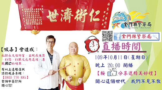 金門縣警察局金湖分局繼日前於7月31日及9月4日,在「金警直播間」辦理「臉書反毒直播宣導」,深獲觀眾熱烈回響後,將於本(10)月11日(星期日)晚間8點,續辦理第三場「英雄不吸毒」直播宣導,歡迎民眾準時收看,一同關心地區毒品現況,並有機會獲得好禮。 金湖分局指出,本次直播內容包含幽默風趣的「反毒模仿秀」及「反毒小劇場」之外,另外特別邀請金門縣教育處督學楊恭墉宣導「校園反毒相關措施」,內容精彩可期,歡迎民眾踴躍收看。 為增加與觀眾互動,直播過程將不定時發送精美禮品,包含有「昇恆昌公司精美杯組」、「古多利咖啡禮包」、「HS汽車機油」及「良金肉乾」等豐富獎品,提醒想要獲得好禮民眾,千萬不要錯過。金湖分局分局長黃維章表示,該分局在「金警直播間」辦理2次反毒宣導,點閱總人數已超過2萬人次,宣導成效良好。本次直播也採跨局處合作方式,邀請本縣教育處宣導相關校園反毒業務,期許在縣府各單位努力之下,共同推動反毒工作,建構無毒校園的教育環境。