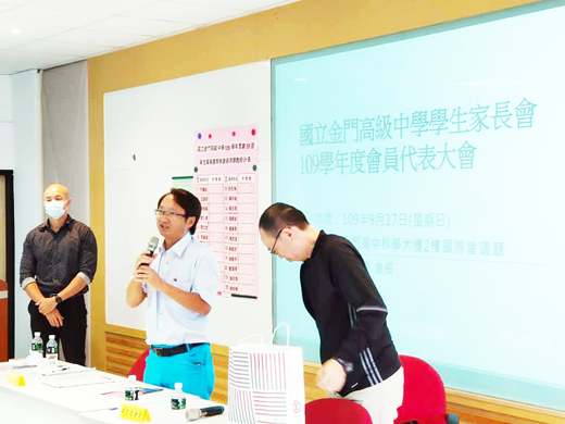 金門高中日前進行學生家長會改選,新任會長由林榮泉接任,原會長楊忠逸卸任會長一職,改任副會長。新任家長會會長林榮泉期許與學校攜手並進,一同為學校做出貢獻,迎向明年的創校七十周年。 金門高中學生家長會日前假學校科學大樓二樓國際會議廳進行改選,第59屆家長會會長由林榮泉接任,副會長有李仁傳、李金譚、楊忠逸三人,王國泰、李根遠、許丕肯任常務委員,委員有15位,包括方耀彪、何佩舉、李立宏、李益杰、林雅鳳、胡淑萍、陳向榮、陳忠輝、陳義榮、童麗羨、蔡毓忠、蔡慧芳、鄭國泰、謝志偉、謝知學。家長代表有文水成、何桂鋒、何智文、吳少昌、吳錫鋪、呂正國、李錫添、李錫鑫、汪精明、辛仲智、洪意芳、洪銘揚、洪蘋萱、胡紫瀅、唐敏雄、翁世澤、翁若瑋、翁嘉昌、張仍上、張雲麗、梁俊彬、許文杰、許建國、許郁梅、許榕植、許績鑫、陳俊輝、陳彥宏、陳雪蔭、陳煌興、陳榮文、陳毅書、黃獻成、楊逸芳、董欣健、蔡建偉、鄭允忠、戴克地、謝惠金、顏士強共40位。總幹事由羅伈媁擔任,顧問聘有陳玉珍、李誠智、陳文顧、吳有家、蔡西湖、李台山、楊紫玫、楊世宏、許可昇、盧冠宇、蔡貽迪等11人,法律顧問則委請楊延壽律師擔任。