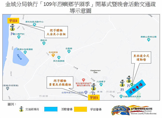 109年「烈嶼鄉芋頭季」開幕式暨晚會活動,將於10月10日上午8時30分至晚間9時30分在烈嶼鄉東林複合式體育場及東林(貴賓組)、東坑(縣籍組)芋頭田舉辦。因應活動可能帶來之人潮與車潮,金門縣警察局金城分局將於活動周邊道路實施交通疏導管制工作,以維護道路之行車順暢及人車安全,並呼籲前往參與之民眾及行經該路段之駕駛人配合員警之指揮。 金城分局指出,烈嶼鄉芋頭季相關系列活動交通疏導管制措施(如左圖)分別如下: 一、前往東林芋田1(鄉公所對面)參加活動貴賓及記者,除搭乘接駁公車外,車輛由八青路方向進入(單向通行),並由現場員警指揮單邊靠右停車。 二、前往東坑芋田2參加活動民眾,除搭乘接駁公車外,車輛一律從九井路往濱海大道方向進入,並由上林方向駛出,車輛請依序在濱海大道順向單邊停車。 三、東林複合式體育場周邊道路禁止車輛(含汽機車)停車,參加活動人員之車輛請停放會場內廣場依序停車,並注意往來遊客及行人安全。 四、轉彎處、路口禁止停放車輛及路邊嚴禁雙邊停放車輛。