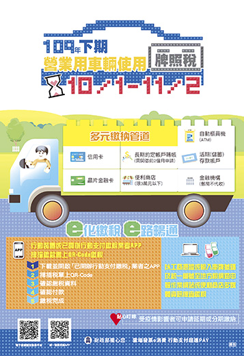 金門縣109年下期營業用使用牌照稅開徵業已上路,課稅範圍依據使用牌照稅法第三條規定,使用公共道路之營業用車輛,除符合使用牌照稅法及其他相關法令規定免徵使用牌照稅者外,均應繳納使用牌照稅,繳納期限至十月三十一日止,徵期一個月,繳款書已分別寄送各納稅義務人,若未收到繳款書或已收到而遺失者,應於限繳日期內向當地稅捐稽徵機關申請補發,並如期完成繳納,以免受罰又傷自己荷包! 依據使用牌照稅法第十條,金門縣稅務局公告金門縣109年下期營業用使用牌照稅開徵自十月一日起至三十一日;其課稅期間為營業用車輛下期使用牌照稅,課稅期間為今年七月一日至十二月三十一日止;如車輛牌照已辦理繳銷、註銷(包括逕行註銷)、吊銷及吊扣牌照或報停者,其使用牌照稅稅額計徵至車輛異動登記前一日止,納稅義務人為金門縣營業用車輛之所有人或使用人。 使用牌照稅係採定額課徵,稅額以各類車輛使用牌照稅稅用牌照稅者外,均應繳納使用牌照稅。它的繳納方式由稅務局填發繳款書郵寄納稅義務人,納稅義務人未收到或遺失繳款書者,應於繳納期限前向稅務局或派駐監理機關服務櫃檯申請補發,亦可利用工商憑證登入地方稅網路申報作業網(網址:https://net.tax.nat.gov.tw/),利用工商/金融憑證或營利事業統一編號加車牌號碼,直接線上查繳稅款。 使用牌照稅稅款繳納方式可採臨櫃繳納、信用卡繳納、轉帳繳納,納稅義務人以信用卡、活期(儲蓄)存款帳戶或晶片金融卡轉帳繳稅者,可透過行動裝置(連結網路繳稅服務網站)或開辦「行動支付工具」繳稅業者之APP,掃描繳款書上QR-Code行動條碼,免輸入銷帳編號、繳稅全額等資料辦理線上繳稅。 納稅義務人至便利商店或以信用卡、自動櫃員機、活期(儲蓄)存款帳戶及晶片金融卡等方式繳稅者,繳納截止日開放至今年十一月四日廿四時前,惟今年十一月三日至四日繳納者,仍屬逾期繳納案件,但不加徵滯納金。稅務局指出逾期繳納者,每逾二日按滯納數額加徵百分之一滯納金,最高可加徵至百分之十五,逾三十日仍未繳納者,移送強制執行;依使用牌照稅法第廿八條第一項逾期未完稅,在滯納期滿後使用公共道路經查獲者,除責令補稅外,應處以應納稅額一倍以下之罰鍰。 為簡政便民,金門縣稅務局表示經核定免稅之車輛,嗣後如其免稅條件未有變更,不必每年按期申請;另車輛如有遺失時,應立即向警察機關報案,以維護車輛所有人權益;交通工具未繳清使用牌照稅及罰鍰前,不得辦理過戶登記;申辦車輛異動時,請攜帶當年期使用牌照稅繳納收據、以免增加退補稅之困擾。還有為維護租稅公平,各稅捐機關除運用警方查獲資料外,每年皆會運用車牌辨識系統及路邊停車格資料,清查未繳稅的車輛,予以裁罰,請車主收到繳款書一定要如期繳納,以免受罰,以維護自己權益。