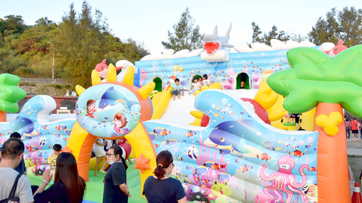 金湖海灘花蛤季現正熱鬧舉行中,鎮公所今年繼續在現場放置最受小朋友歡迎的「充氣城堡」,許多小朋友看到活動現場有座充氣城堡,急著衝進去玩,家長拉也拉不動;小朋友們在充氣城堡裡又走又跳,玩得滿身大汗,一點也不會累,直到爸媽喊該回家了,還捨不得出來。這座「氣墊城堡」在花蛤季3天期間都會在成功出海口廣場,爸媽可帶小朋友去「放電」。