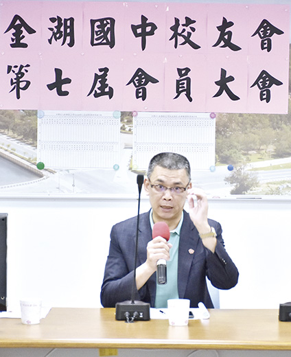 金湖國中校友會近日召開會員代表大會及選舉第7屆新任理監事。眾多傑出校友出席參與改選,順利選舉出第7屆理事長,由蔡其雍當選連任。 湖中校友會第7屆當選理事共15名,包括呂瑞泰、陳文顧、李孝光、許雪芳為常務理事,李仁傳、陳文傑、楊紫玫、陳俊輝、洪海水、林嘉森、蔡建立、陳秀卿、陳為信、陳為學為理事。監事當選5名,陳水福為常務監事,陳錦偉、蔡西湖、蔡顯慶、陳錦章為監事。 會議中同時討論擴大舉辦金湖國中55週年校慶,校友會與校方共議舉辦方式,也舉薦諸多傑出校友人選,並對校務發展與學生活動提出建言與討論,在蔡其雍理事長的領導下,充分展現學校與校友一家親的精神,蔡其雍也肯定母校積極辦學的表現,期盼師長的努力,為我們的社會培育更多優質的各行各業人才。 金湖國中校長謝志偉感謝校友會在校務推動上的鼎力相助,並期待社會各界持續推薦傑出校友,自即日起至11月10日止可受理推薦,以作為學弟妹們典範學習的對象。