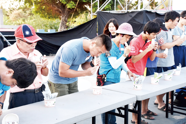 金湖海灘花蛤季昨(4)日邁入最後一天,下午進行「吃冰大賽」,吸引近200位民眾報名參加,有身強體壯的阿兵哥組隊參加,也有老阿伯老阿嬤要來挑戰牙齒,也有小朋友就是想來吃冰,還有全家大小一起報名。參賽者須吃完大會提供的3支冰棒,比速度,每組10人,分組第一名即可獲得1000元,全部參賽者速度最快者,可以再加碼獲得500元。許多人卯起來猛塞冰到嘴巴裡,甚至有人吃到牙齒流血,十分拚命,但也有人慢條斯理慢慢吃,被主持人開玩笑說「是不是單純想來吃冰」。