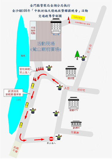 金沙鎮109年中秋祈福天燈施放暨聯歡晚會活動,將於9月30日晚間19時在浦山里六甲鶯山廟前廣場辦理,現場規劃表演節目、天燈施放及摸彩活動。 為因應活動可能帶來之人潮與車潮,縣警察局金湖分局屆時將於會場周邊道路實施交通疏導管制工作,以維道路之行車順暢及人車安全,並呼籲前往參與之民眾可多利用大眾運輸工具或共乘交通工具,如自行駕車前往會場或行經該路段之駕駛人請配合員警或義交人員之指揮。 金湖分局指出,活動周邊道路交通管制措施如下: 一、交通管制部分:活動會場及施放天燈區域設於六甲鶯山廟前廣場,禁止車輛進入。 二、停車區部分:參與活動人員之車輛可停放於劉澳海堤(順向單邊停車)及鶯山廟後方停車格,如仍不足則開放往后宅、洋山路段之產業道路右側單邊停車;機車可停放於入口管制處之兩旁道路。