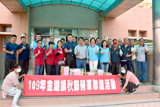 中秋節前夕,金湖鎮各界昨(21)日下午展開勞軍活動,由鎮長陳文顧與代表會副主席林麗芬率領鎮代表蔡建偉、林嘉森、陳秀卿、洪海水以及各里里長、金湖鎮後備軍人輔導中心、金門縣軍人之友社、青溪婦女金湖分會,及鎮公所同仁,陸續走訪金門縣警察局金湖分局、聯勤金門地區支援指揮部、岸巡總隊部、海龍部隊、海巡隊、金門縣消防局金湖消防分隊,感謝地區駐軍以及轄區的警消人員平日對金湖轄區內的國安、治安維護、救災救護等的辛勤及努力。 陳文顧表示,有感於軍警消平日對於治安、交通及防疫工作的努力投入,且在即將到來的中秋節4天連假,軍警仍堅守崗位守護民眾的安全,努力讓民眾有一個安居樂業的優質宜居家園,在此給予萬分肯定與讚賞,感謝金湖地區軍警消弟兄們平時對於鎮務的配合與協助,也肩負保衛金門的任務,勞苦功高,備極辛勞;因此鎮公所與鎮代會獻上一些禮品,讓軍警消弟兄們在假期辛苦輪值時,也能感受過節氣氛。各單位主官也親自出面迎接勞軍人員,對於各單位的一片心意,表達感謝。 代表會副主席林麗芬表示,月到中秋分外明,人到佳節特別親。我國傳統節日中秋節來臨之際,公所及代表會前往慰問金湖地區軍警消弟兄們,他們平日必須要犧牲與家人團聚的重要節日堅守崗位,表達十二萬分的敬意與謝意,而且金湖鎮有任何需要軍警消弟兄們的協助,弟兄們也都是適時給予協助,他特別向軍警消弟兄們祝福佳節快樂。