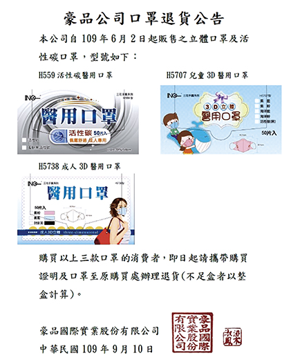 豪品國際實業股份有限公司自大陸地區進口非醫療用口罩約上千萬片,換裝混充成「台灣製」MIT醫用口罩,金門縣衛生局詳查後,確認豪品公司口罩並未流入金門,請鄉親放心。 「口罩國家隊」自黑心口罩事件爆發後,彰化地方檢察署查獲豪品國際實業股份有限公司自109年6月2日起,自大陸地區進口非醫療用口罩約上千萬片,換裝混充成「台灣製」MIT醫用口罩,為3D立體口罩(含成人用及兒童用)及平面活性炭口罩,並已流入實體店面及網站上販售;經濟部初步核對,大陸製口罩應未流入實名制通路。 金門縣衛生局表示,9月10日調查轄內實名制口罩販售之藥局及衛生所及非實名制市售盒裝口罩之賣場及藥粧店等,經查豪品公司口罩未流入金門之上述販售點,衛生局表示,會嚴格把關,將持續加強稽查口罩產品流向,請鄉親放心。 豪品國際實業股份有限公司公告自109年6月2日起,凡購買型號為:H559活性炭醫用口罩、H5705兒童3D醫用口罩及H5738成人3D醫用口罩等3款口罩的消費者,即日起請攜帶購買證明及口罩至原購買處辦理退貨,豪品公司電話04-8346-280。
