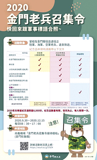 金門老兵召集令活動自去年12月底結束後,老兵反應熱絡,不少人表態今年還要來參加,縣府在今年6月間疫情稍歇時也從善如流,由觀光處主導提前公布相關活動期程從9月30日至12月15日,希望延續去年活動熱度,並讓昔日戍守前線的金門老兵能有更充裕的時間規劃返金遊程。 但針對臺籍和縣籍老兵有無差別待遇,連日來卻引發各界熱議,為免老兵誤解,縣府昨日特別發布新聞稿指出,不論臺灣籍或金門籍老兵,只要攜帶在金服役佐證文件、來金機票和住宿證明,參與活動,即可申領限量專屬紀念品。而住在金門的金門老兵,不必來金機票及住宿證明,只要號召昔日一起服役的4名同袍返金參加活動,一樣可申領專屬紀念品。 觀光處表示,由於居住金門的老兵,不需要專程搭機返金或住宿旅宿,引起少數老兵誤解,認為申領紀念品的資格規定,有歧視居住金門老兵之虞。觀光處鄭重澄清,臺灣籍和金門籍老兵沒有差別待遇,甚至針對居住金門的老兵提供替代方案,一樣享有專屬紀念品。 觀光處說明,居住金門的老兵,只要號召昔日一起服役的臺灣4名同袍來金參加活動,就可憑接機照片和陪同旅遊照片,替代機票和住宿證明,加上金門服役佐證文件、身分證、與標語合照,即可申領專屬紀念品。 對於很多老兵來電反映「在金服役佐證文件」怎麼取得?觀光處也說明,舉凡證件、文件、照片、獎狀、勳章、派令、金門部隊提供紀念的私章、金門出任務時的保險單、金門部隊核發的休假單、金門部隊核發的通行證、金門輪調令、金門軍人身分證等,甚至是金門郵局郵戳之金門部隊信箱的家書情書、服役時刺在身上的小金門字樣及地圖、標語刺青,只要能容易辨明與在金門服役有關者,均可做為在金服役佐證文件。 金門老兵召集令活動,對象是曾經在金門服役且已退役的陸軍、海軍、空軍老兵,在活動期間參與的老兵均得申領專屬紀念品。申領條件包括金門服役證明文件、身分證、來金機票、金門合法旅宿住宿證明,及與金門軍事標語合照照片。 紀念品有「2020年金門老兵專屬紀念酒」1瓶、設計精美富紀念價值的「到金禮」識別證套、「神祕禮」長版手機長吊帶共3樣,每樣限量8000份,每人限領1份,送完為止。活動辦法可上〈金門觀光旅遊網〉查詢:https://kinmen.travel/zh-tw/event-calendar/details/2464。