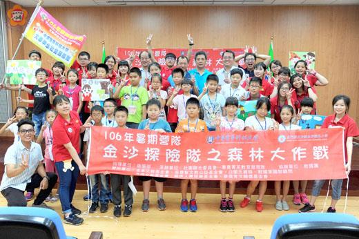 106年救國團金沙探險之醫療社會服務隊開抵金沙國小,十六位來自中華醫事科技大學的小隊輔們飛抵金門,帶領小朋友們進行三天的營隊活動,開訓典禮氣氛熱絡、歡笑聲不絕於耳。 這場開訓儀式於昨天上午九時在金沙國小視聽教室登場,包括金沙國小校長李國安、救國團金門團委會指導委員馬志亮、救國團金門團委會總幹事徐國華均出席與會,來自台灣的十六名自願工作大專學生,以及參與營隊近五十名活動的小朋友也在現場參與觀禮。 對於中華醫事科技大學專程跨海來金辦理營隊活動,李國安與馬志亮期許營隊能夠協助地區學童在暑假期間,擁有一個良好的學習環境與充實歡樂的假期生活,更感謝救國團與校方對此活動的支持,未來仍會持續精進辦理各項暑期營隊活動。 據中華醫事科技大學表示,此次辦理的營隊活動課程內容豐富,其中包括了反菸與反毒宣導,導正青少年們對於菸害的觀念,並利用與志工伙伴們間的互動搶答方式,激起青少年們的活潑好勝心,以至於達到融入課程的效果,讓學員能深刻的體會到毒品對自己及家人所受到的危害。 課程並安排了人權教育(反霸凌),教導小朋友們人與人之間相處的道理,營隊同時穿插了緊急醫療、國際教育、大地遊戲、營火晚會等活動,帶領小朋友親自操作急救技巧,將日常中上課所學的事物與現在國際的發展方向搭上關係,並教導他們有哪些國際新聞網站可以多加利用查詢,讓小朋友們渡過一個充實又豐富的暑假。